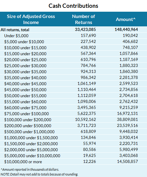 Taxpayers may deduct contributions made in cash or by check to charitable organizations, but only to the extent that the donation exceeds any value the donor receives.In 2011, 34.6 million taxpayers deducted a total of $139 billion of gifts to charitable organizations made by cash or check.