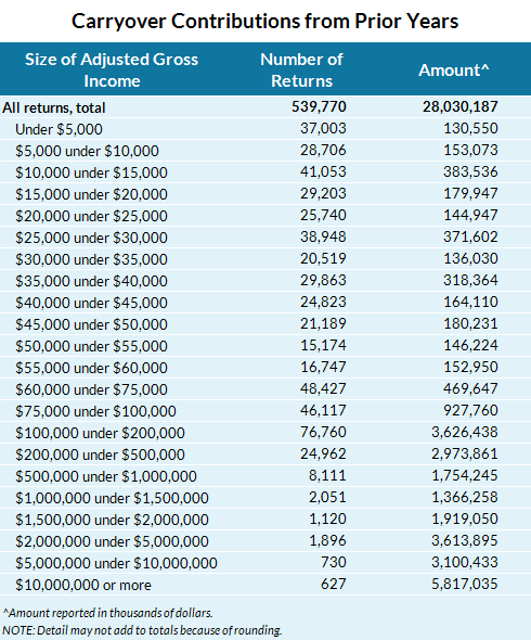 Charitable contributions are limited to no more than 50 percent of AGI. Donations over the limit may be deducted in future years.In 2011, 579,000 taxpayers claimed a total of $33 billion of charitable contributions carried over from previous years.