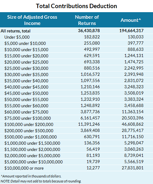 Charitable contributions are limited to no more than 50 percent of AGI. Donations over the limit may be deducted in future years.In 2011, 579,000 taxpayers claimed a total of $33 billion of charitable contributions carried over from previous years.