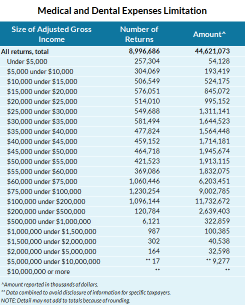 Taxpayers who itemize their deductions may deduct medical and dental expenses in excess of 10 percent of AGI (7.5 percent for people age 65 or over).In 2011, taxpayers deducted a total of $84.9 billion of medical expenses.