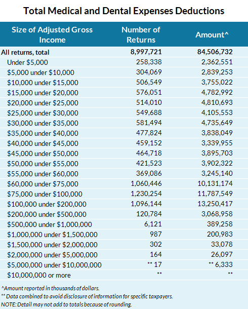 Taxpayers who itemize their deductions may deduct medical and dental expenses in excess of 10 percent of AGI (7.5 percent for people age 65 or over).In 2011, taxpayers deducted a total of $84.9 billion of medical expenses.