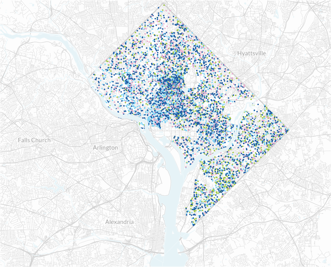 What has been different in recent years is that, in addition to blacks moving out as they have done in prior decades, whites and others are now moving in and are more likely to stay. Looking at the maps, you can see that the areas where blacks moved out and the areas where whites moved in are roughly the same. Columbia Heights–Mt. Pleasant gained 8,300 white residents, while about 6,500 whites moved into the Union Station area. White residents largely avoided neighborhoods east of the Anacostia River.