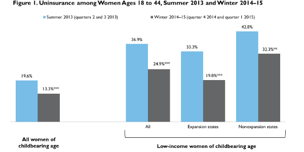 The uninsurance rate among women of childbearing age decreased from 19.6 percent in summer 2013 to 13.3 percent in winter 2014–15, representing an increase in coverage for 5.5 million women (figure 1).5 Following the implementation of the ACA’s major coverage provisions, the uninsurance rate among women of childbearing age decreased 6.3 percentage points, from 19.6 to 13.3 percent. For low-income women targeted by the ACA’s Medicaid expansion, the reduction in uninsurance was particularly large, declining 12.0 percentage points overall from 36.9 percent to 24.9 percent. Nonetheless, nearly one in four low-income women of childbearing age was uninsured in winter 2014–15, highlighting the need for both ongoing outreach to enroll uninsured, Medicaid-eligible low-income women and support for safety-net services for those who are not eligible for Medicaid.