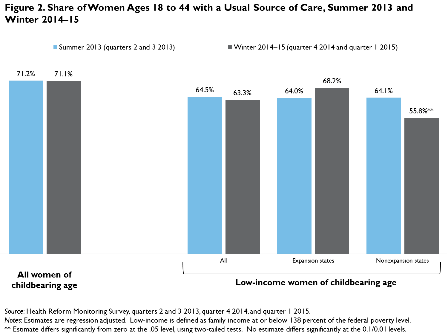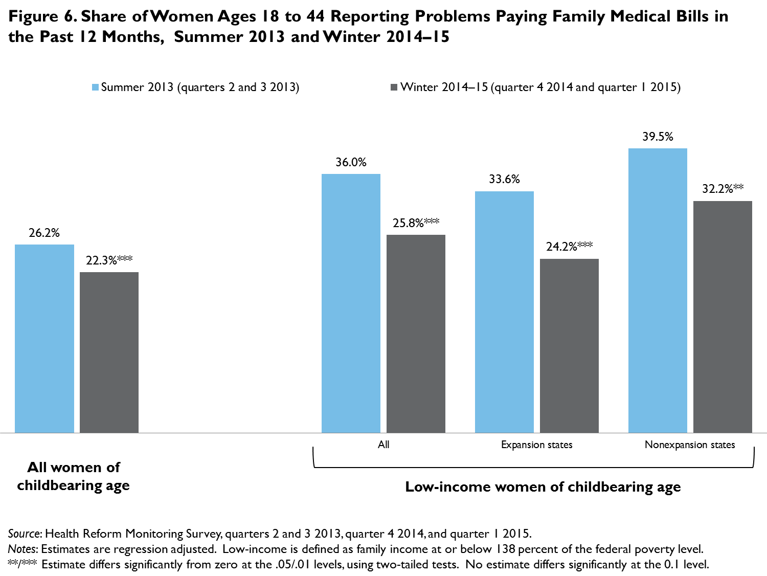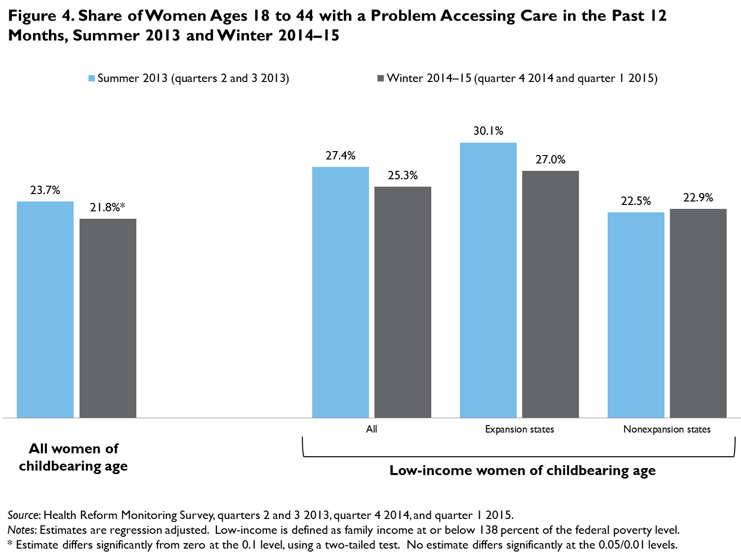 Though broad measures of access to care remained largely stable between summer 2013 and winter 2014–15 for women of childbearing age, we do find reductions in barriers to care and family problems paying medical bills. A lower share of women report unmet need for care because of cost. These improvements were particularly pronounced for low-income women, who experienced declines in unmet need in both Medicaid expansion and nonexpansion states. Some low-income women in nonexpansion states could qualify for subsidized coverage through the health insurance Marketplaces, and some low-income women of childbearing age could also qualify for Medicaid under pre-ACA standards. Simplified application procedures and increased awareness and outreach could contribute to the improvements in insurance coverage and affordability we find in our analysis. In addition, other factors, such as an improving economy and slowed growth in health care spending, could also contribute to the improvements in affordability we find.
