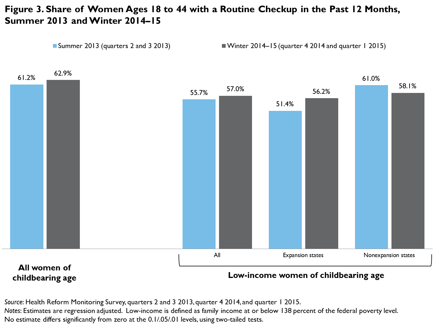 Broad measures of access to care reflecting connection to and use of the health care system support the conclusion that access to care has broadly remained stable between summer 2013 and winter 2014–15 for women of childbearing age. Not all women will require a routine checkup every 12 months, and recent recommendations have shifted away from annual Pap smears for women and annual checkups for all adults (Krogsboll et al. 2012).6 However, routine checkups remain a consistent marker of health care utilization, and evidence suggests that the levels of routine checkups have held steady. It may take some time for women to need and obtain a routine checkup, so it may be too early in ACA implementation to realize any marked improvements in utilization. In addition, some have expressed concerns that rapid increases in the number of people with insurance coverage would stress provider capacity and reduce access (Hill, Wilkinson, and Holahan 2014). Currently, however, we do not find evidence that these concerns have materialized for women of childbearing age (though it may take time for newly insured individuals to change care-seeking behavior), and the expiration of federal support for temporary enhanced reimbursement for Medicaid primary care services could affect access to providers (Medicaid and CHIP Payment and Access Commission 2015).