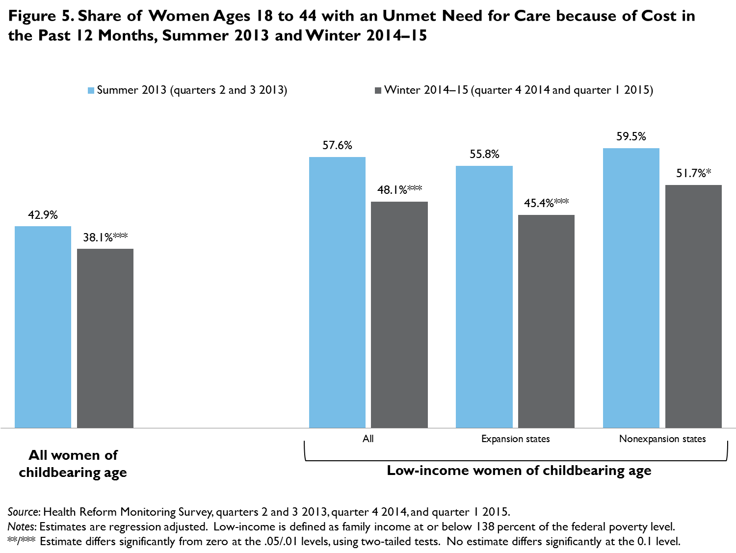 Barriers to care are beginning to decrease for women of childbearing age. A lower share of women reported problems accessing care in winter 2014–15 (21.8 percent, figure 4) than in summer 2013 (23.7 percent), and women were also less likely to report unmet need for care because of cost in the past 12 months (38.1 versus 42.9 percent in summer 2013; figure 5). Low-income women in particular reported fewer cost-related barriers to care after the implementation of the ACA’s coverage provisions: the share reporting unmet need for care because of cost declined 9.5 percentage points from 57.6 percent in summer 2013 to 48.1 percent in winter 2014–15.