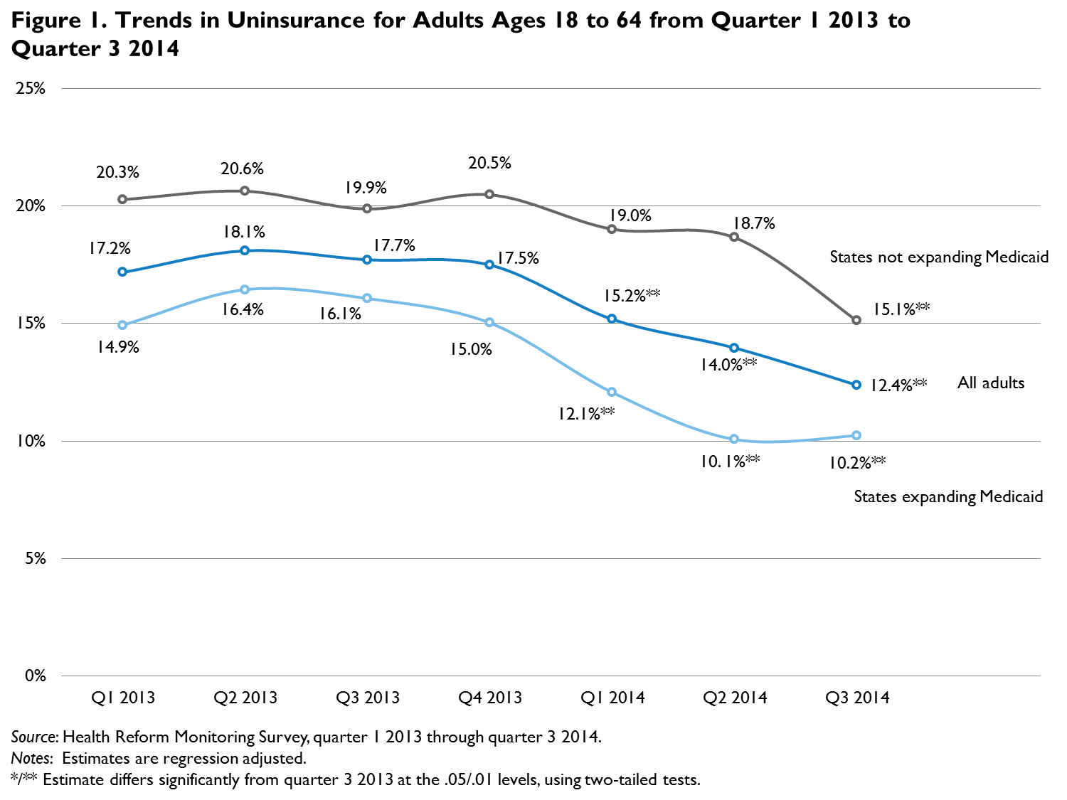 To control for the potential influence of changes in the characteristics of the HRMS sample, we estimate weighted regression models that control for demographic and socioeconomic characteristics, internet access, and geography.8 We consider changes in insurance coverage for (1) all nonelderly adults;9 (2) adults targeted by the Medicaid expansion and the Marketplaces; (3) adults in states that had and had not adopted the ACA’s optional Medicaid expansion by September 1, 2014; and (4) adults in important demographic and socioeconomic subgroups such as age, gender, race and ethnicity, and family income. Controlling for differences in the respondents’ characteristics through time allows us to remove variation in insurance coverage caused by changes in the types of people responding to the survey rather than by changes in the health insurance landscape. In presenting the regression-adjusted estimates, we use the predicted rate of uninsurance in each quarter for the same nationally representative population. For this analysis, we base the nationally representative sample on survey respondents from the most recent 12-month period of the HRMS (i.e., quarter 4 of 2013 and quarters 1–3 of 2014). Although we control for sample characteristics over time, we are not attempting to disentangle the effects of the ACA from other factors that also changed between September 2013 and September 2014, such as gains in insurance coverage caused by the economy continuing to recover from the recession.