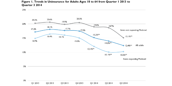 Adults in states that implemented the ACA's Medicaid expansion sustained the large coverage gains from the previous quarter, and insurance coverage also rose sharply for adults in nonexpansion states. The uninsurance rate for adults in expansion states dropped 5.8 percentage points (95% CI [4.5, 7.2]) since September 2013; the rate dropped 4.8 percentage points (95% CI [3.2, 6.3]) in the nonexpansion states. This is a decline in the uninsurance rate of 36.3 percent in expansion states and 23.9 percent in nonexpansion states. Most of the estimated decline in the uninsurance rate in the nonexpansion states occurred between June and September 2014 (figure 1). Consequently, the gap in the uninsurance rate between expansion and nonexpansion states, which had widened between September 2013 and June 2014, narrowed somewhat between June 2014 and September 2014. Nonetheless, in September 2014, the uninsurance rate in expansion states was 4.9 percentage points lower than in nonexpansion states; that difference was 3.8 percentage points in September 2013. In September 2014, 54.7 percent of uninsured adults resided in nonexpansion states.