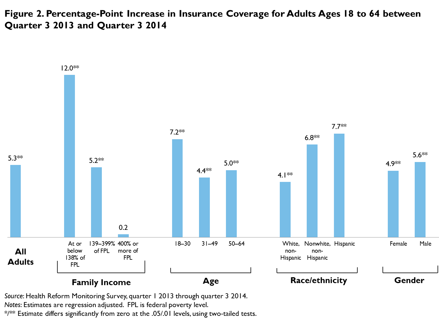In discussing our findings, we focus on statistically significant changes in insurance coverage over time (defined as differences that are significantly different from zero at the 5 percent level or lower) and highlight changes relative to September 2013. We provide a 95 percent confidence interval (CI) for key estimates. The basic patterns shown for the regression-adjusted measures are similar to those based solely on simple weighted (unadjusted) estimates. To extrapolate our estimates of changes in uninsurance rates to the number of adults who have gained coverage over the same period, we use projections for the size of the 2014 population from the US Census Bureau.10