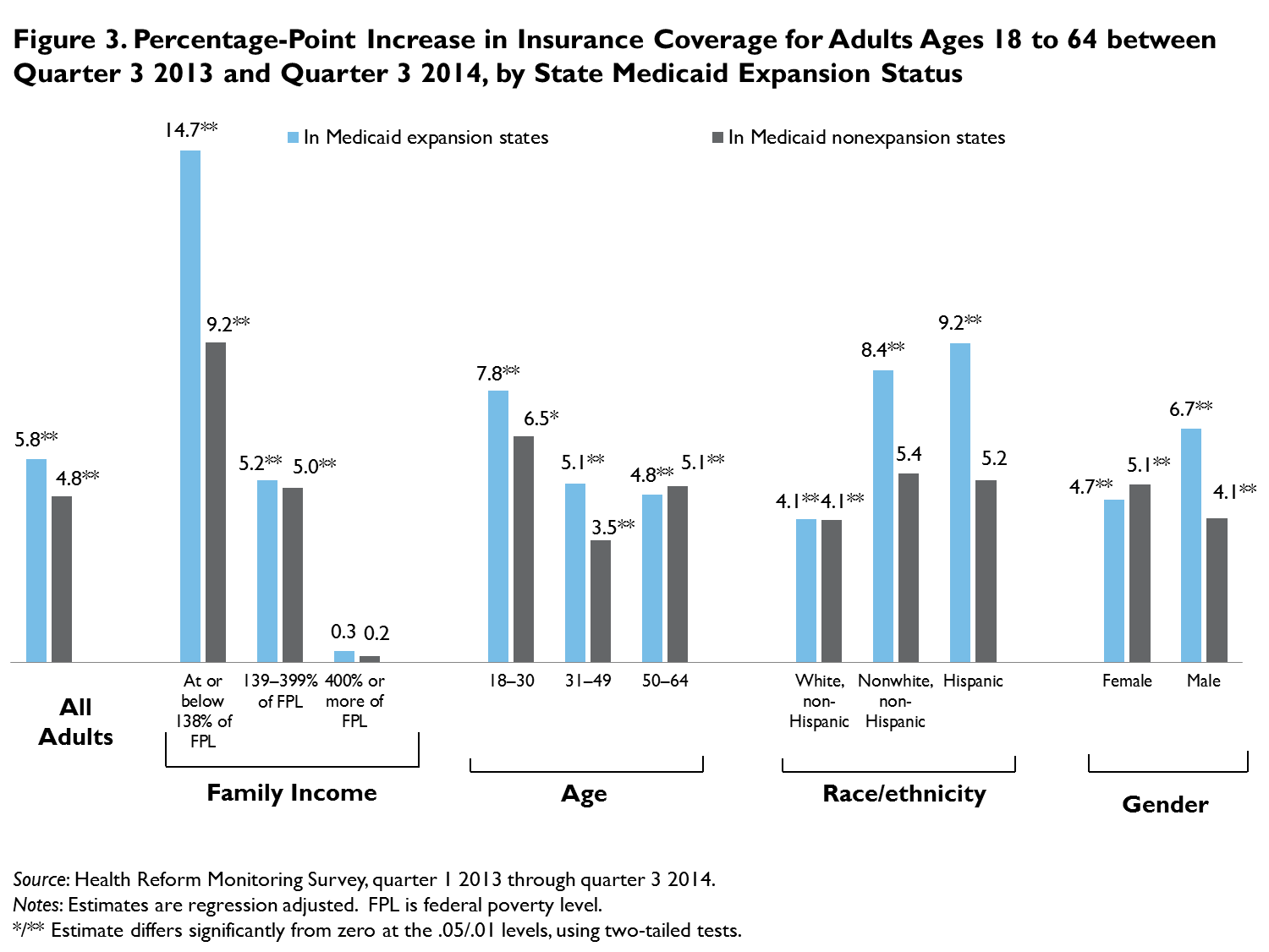 The uninsurance rate for nonelderly adults has fallen sharply since the first Marketplace open enrollment period began in October 2013, with larger gains in states that expanded Medicaid and among adults targeted by the Medicaid expansion and the new Marketplace subsidies. Our estimates show that approximately 10.6 million nonelderly adults (with a 95 percent confidence interval of 8.5 million to 12.6 million) gained coverage between September 2013 and September 2014: a 30.1 percent decrease in the national uninsurance rate for this population. As noted previously (Long, Kenney, Zuckerman, Wissoker, Shartzer, et al. 2014), these estimates do not reflect the effects of ACA provisions implemented before 2013 (such as the ability to keep dependents on a parent’s health plan until age 26 and early state Medicaid expansions), nor do they account for changes in health insurance coverage that would have occurred independently of the ACA, such as those associated with an improving economy.