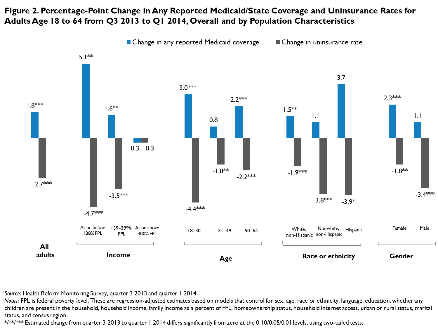 Although each round of the HRMS is weighted to be nationally representative, we use a regression model to control for changes in the characteristics of the sample over time that may not be fully captured by the weights. To produce estimated changes in Medicaid/state coverage and uninsurance rates, we estimate a weighted regression model that controls for sex, age, language, race or ethnicity, whether any children are present in the household, education, census region, marital status, homeownership status, an urban or rural indicator, household Internet access, household income, and family income. In presenting the regression-adjusted estimates, we use the predicted rate of uninsurance and Medicaid/state coverage in each quarter for the same nationally representative population. For this analysis, we base the nationally representative sample on survey respondents from the most recent 12-month period of the HRMS (i.e., quarters 2, 3, and 4 of 2013 and quarter 1 [March] of 2014). By controlling for the sociodemographic characteristics of the sample, we remove variation in insurance coverage that can be explained by the observed characteristics of people in each quarterly sample rather than by the change in health insurance options available under the ACA (which is the concept needed to estimate ACA-related change). See tables 3 and 4 for unadjusted estimates.