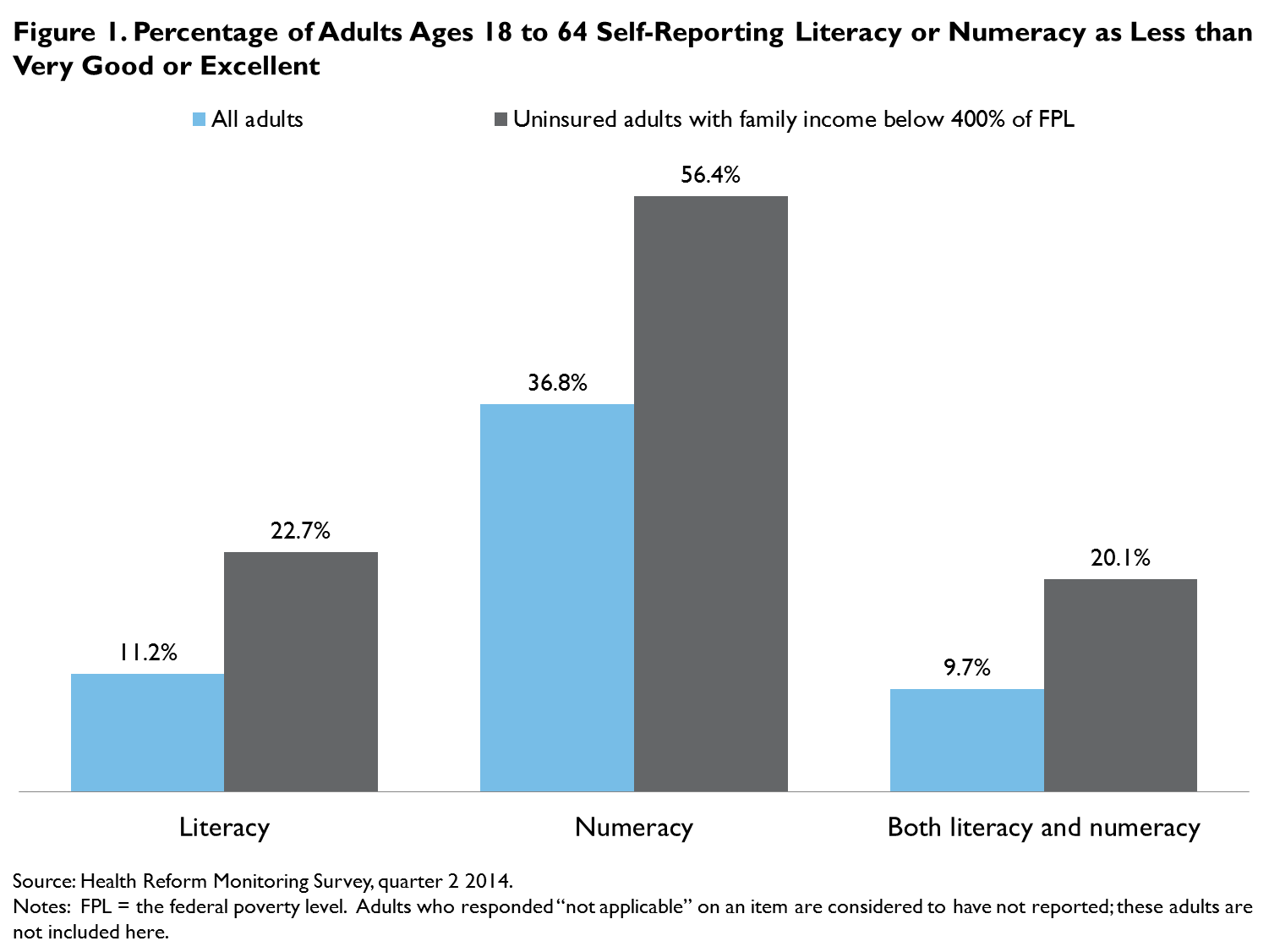 We present self-reported literacy and numeracy for all nonelderly adults in our sample and highlight uninsured nonelderly adults with family income below 400 percent of the federal poverty level (FPL), the target population for subsidized coverage through the health insurance Marketplaces or expanded Medicaid coverage established under the ACA.1