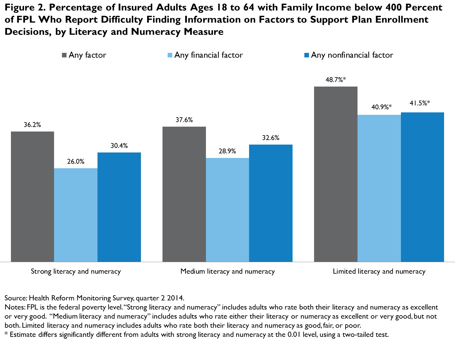 Gaps in literacy and numeracy among the uninsured will likely make navigating the health care system difficult, as indicated by the past experiences of insured adults in choosing a health plan. Fully 48.7 percent of insured adults with income below 400 percent of FPL who had limited literacy and numeracy report they had difficulty finding information on one or more factors to support their plan choice when they last selected a health plan (figure 2). Insured adults in this income group with limited literacy and numeracy report similar levels of difficulty finding information for both financial and nonfinancial factors (40.9 and 41.5 percent, respectively). These patterns are similar if we expand the sample to include all insured adults, among whom 48.4 percent with limited literacy and numeracy report difficulty finding information on one or more factors (data not shown).