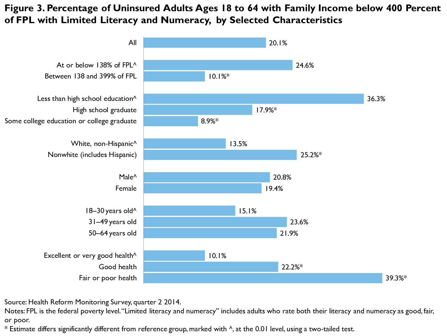 Identifying uninsured adults with limited literacy and numeracy skills for targeted outreach efforts and decision support assistance will be challenging because literacy and numeracy gaps cross demographic, socioeconomic, and geographic lines. Although our sample size is small for some subgroups, limited literacy and numeracy are reported by uninsured adults of all ages, races, and ethnicities; men and women; and adults with family income below 400 percent of FPL (figure 3). However, problems with literacy levels appear to be more pronounced for uninsured Hispanic adults (data not shown) and adults with low levels of educational attainment. In addition, a higher share of uninsured adults with family income at or below 138 percent of FPL (the target range for Medicaid eligibility under the ACA expansions) report literacy and numeracy issues than uninsured adults targeted for Marketplace subsidies (24.6 percent and 10.1 percent, respectively). Notably, 39.3 percent of uninsured adults in fair or poor health with income below 400 percent of FPL have limited literacy and numeracy; this group is likely to need health care services and to use insurance policies after gaining coverage.