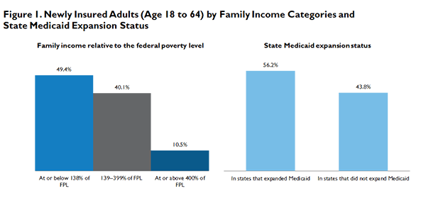 Most of the newly insured adults are in the income groups targeted by the ACA’s Medicaid expansion and the health insurance Marketplaces. Nearly half of the newly insured adults (49.4 percent) have family incomes at or below 138 percent of the federal poverty level (FPL), the income group targeted by the Medicaid expansion (figure 1). Another 40.1 percent have family income between 139 and 399 percent of FPL, the income group that could be eligible for subsidized coverage through the Marketplace. Only 10.5 percent of the newly insured adults have family income at or above 400 percent of FPL.