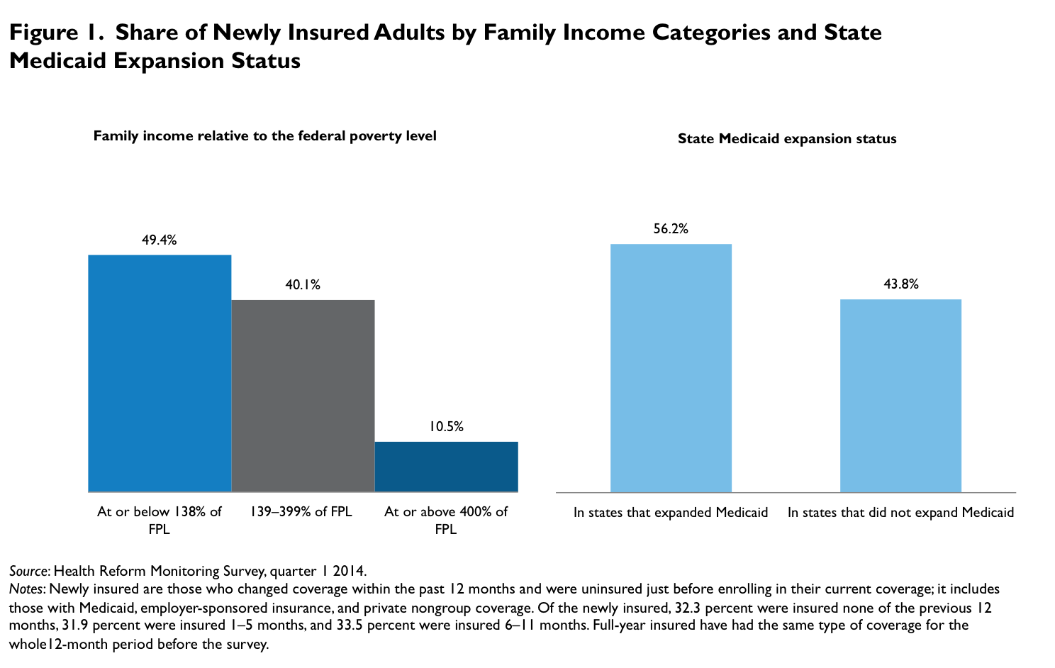 Note 1 See also “US Uninsured Rate Drops to 13.4%,” Gallup, May 5, 2014. 2 Long, Sharon K., Genevieve M. Kenney, Stephen Zuckerman, Douglas Wissoker, Dana Goin, Katherine Hempstead, Michael Karpman, and Nathaniel Anderson. “Early Estimates Indicate Rapid Increase in Health Insurance Coverage under the ACA: A Promising Start.” Washington, DC: Urban Institute, 2014. 3 In this brief, comparisons between the newly insured, full-year insured, and remaining uninsured are not adjusted for age, gender, or other demographic characteristics. Among the newly insured, 32.3 percent were insured none of the previous 12 months, 31.9 percent were insured 1–5 months, and 33.5 percent were insured 6–11 months. 4 By definition, the newly insured excludes those who had coverage before enrolling in Medicaid or health plans through Marketplaces. 5 April 2014 estimates from HHS find that 28 percent of enrollees in health plans through the Marketplace were under age 35; our definition of newly insured differs from the population in the HHS report in important ways that could contribute to the different age distributions. For example, we include in the newly insured adults with Medicaid and ESI, and the HHS estimates include those who may have had coverage prior to enrolling in health plans through the Marketplace. 6 Two states elected to expand Medicaid coverage but had not implemented the expansion as of April 1, 2014. 7 Special enrollment periods in Marketplace health plans are possible if an individual experiences a qualifying life event, such as a move to another state or a change in income or family size.
