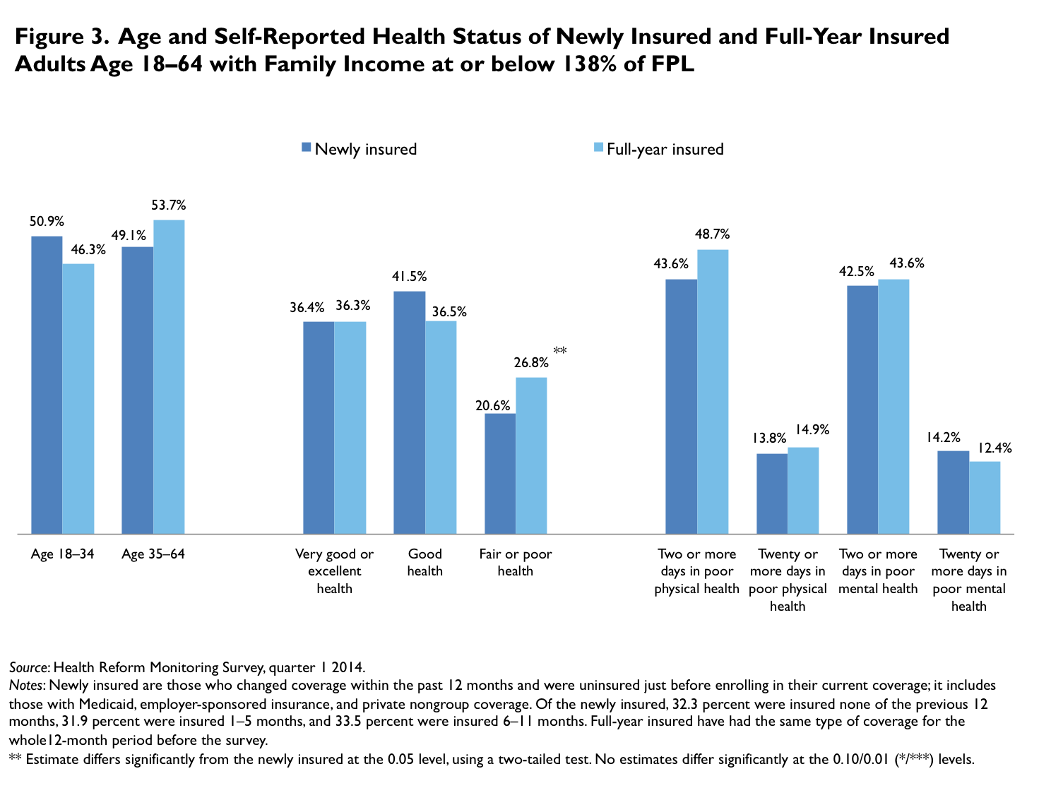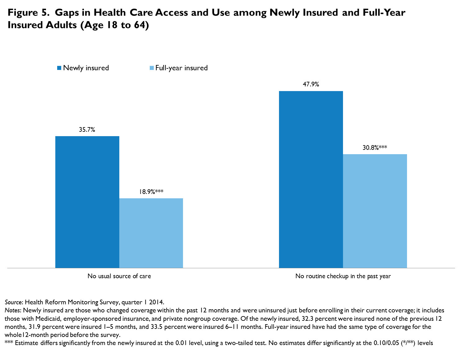 The newly insured adults often lack a strong connection to the health care system; more than a third (35.7 percent) did not have a usual source of care at the time of the survey. Further, almost half (47.9 percent) reported that it has been a year or more since their last routine checkup. These levels are much higher than those reported for full-year insured adults, at 18.9 percent without a usual source of care and 30.8 percent without a routine checkup in the previous year (figure 5).