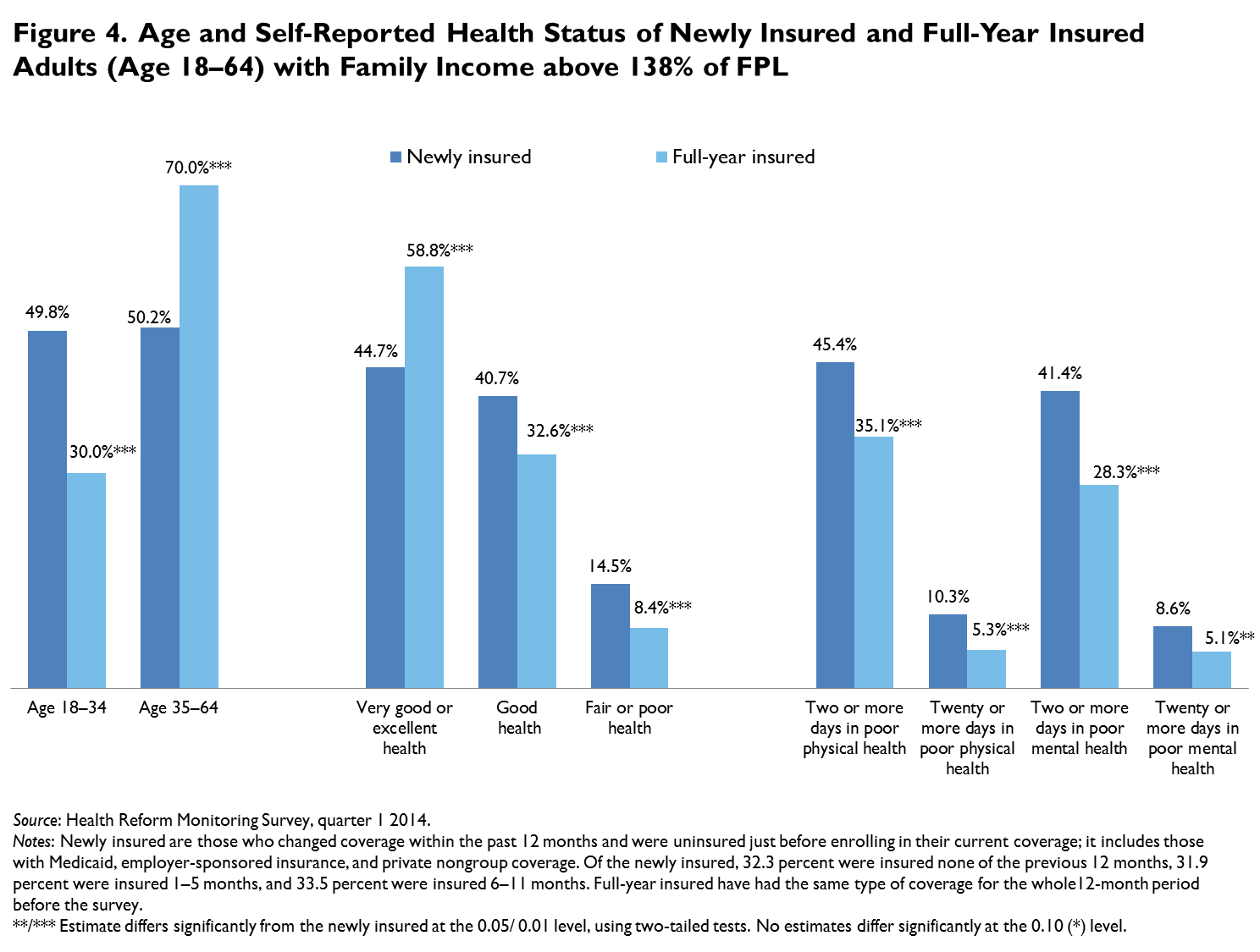 The newly insured adults tend to be younger than adults who had coverage for the full year (50.4 percent versus 33.0 percent under age 35); however, they are more likely to report fair or poor health than full-year insured adults (17.4 percent versus 11.8 percent).5 While 81.8 percent of the newly insured are in good, very good, or excellent health, about 1 in 5 newly insured adults is in fair or poor health. The newly insured adults are also more likely than adults who had coverage for the full year to report days with poor physical and mental health, a measure of health-related quality of life (figure 2). However, when we focus on the population targeted by the Medicaid expansion (family income at or below 138 percent of FPL), we find that newly insured low-income adults are less likely than the full-year insured adults in that income range to be in fair or poor health (figure 3). However, among adults with family incomes above 138 percent of FPL, we find the newly insured are more likely than the full-year insured to be in fair or poor health and to report having days in poor physical or mental health (figure 4). Thus, while the newly insured overall may have higher health care needs than all adults with full-year coverage, that is not the case among adults within the target populations for the Medicaid expansion.