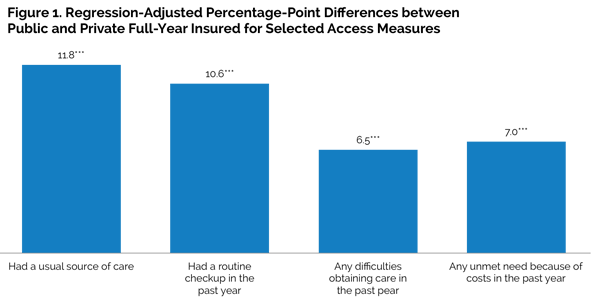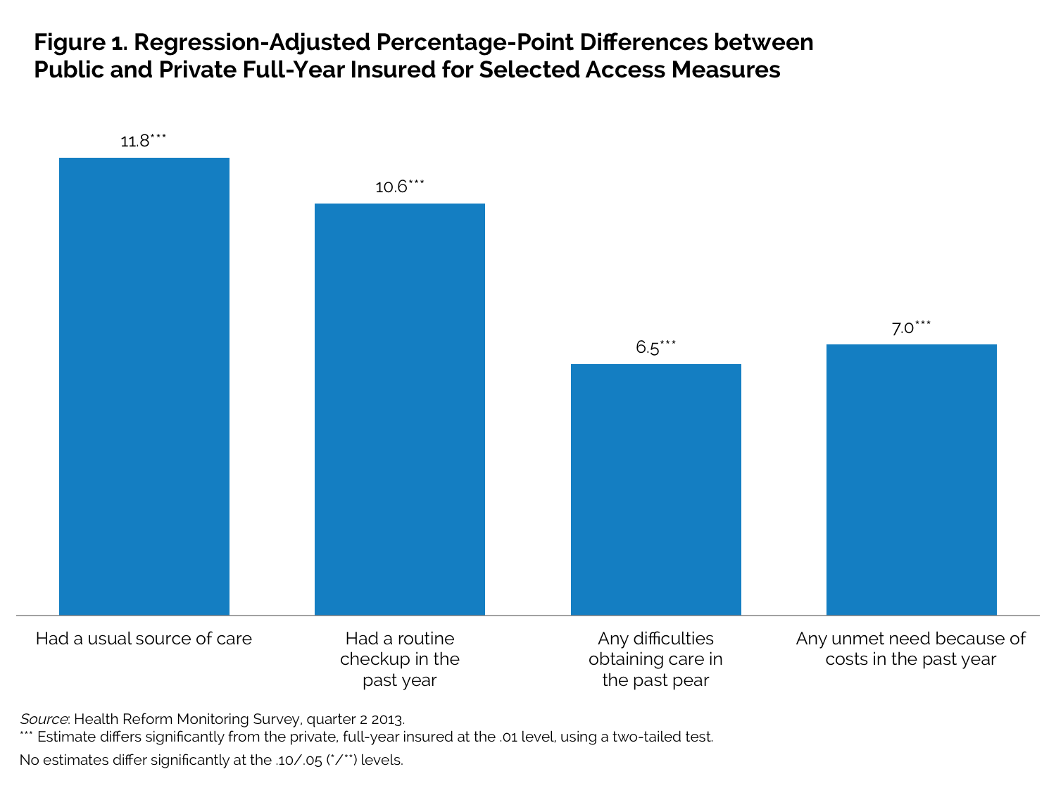 Publicly insured adults fare well in many, but not all, measures of access and affordability. Compared with the privately insured, those with public full-year coverage are more likely to have a usual source of care (83.3 percent versus 76.8 percent) or to have had a routine checkup in the prior year (77.5 percent versus 67.2 percent). However, they are also far more likely to report difficulty in obtaining care (29.4 percent versus 16.7 percent) and finding a doctor (8.5 percent versus 3.5 percent) in the prior year, including more trouble finding a doctor who would accept their insurance (16.2 percent versus 4.9 percent). The regression-adjusted differences in these measures remain significant, but are slightly smaller in magnitude (figure 1).