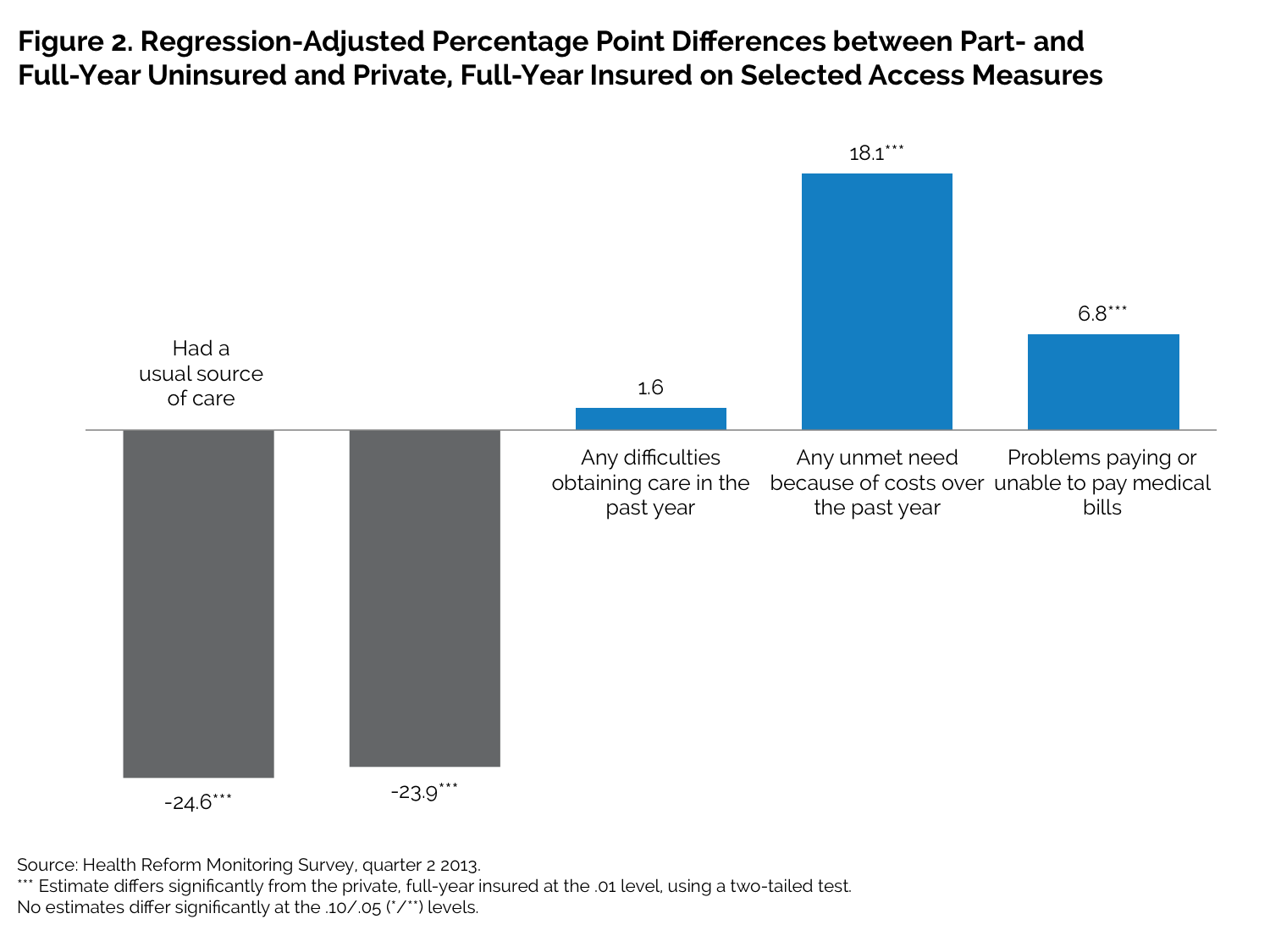 Those who were uninsured for all or part of the prior year report substantially greater problems with access and affordability, with significant regression-adjusted differences for all measures. This also bodes well for the future, suggesting that the problems of the uninsured should be greatly reduced as they gain coverage under the ACA.