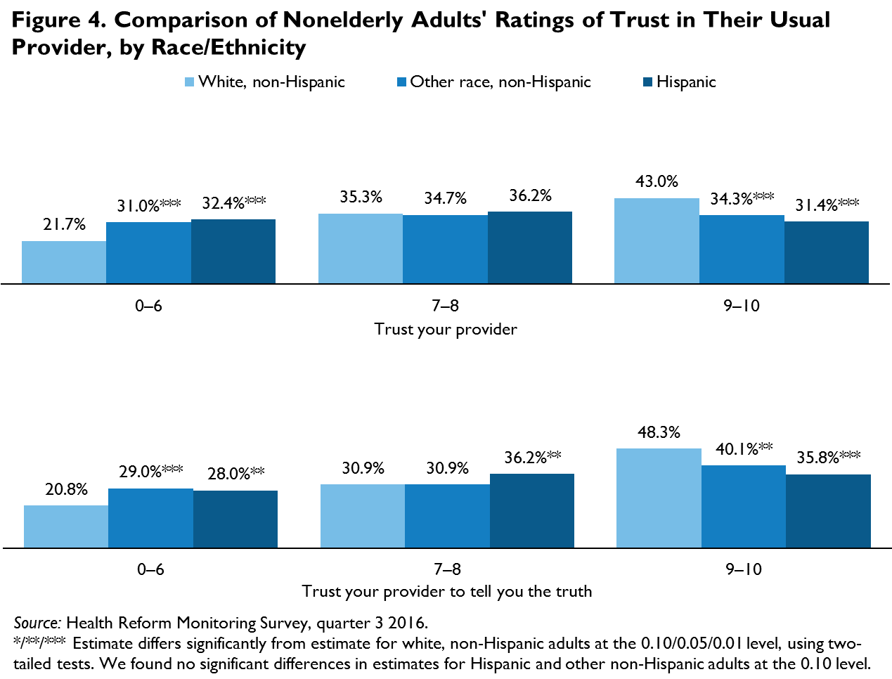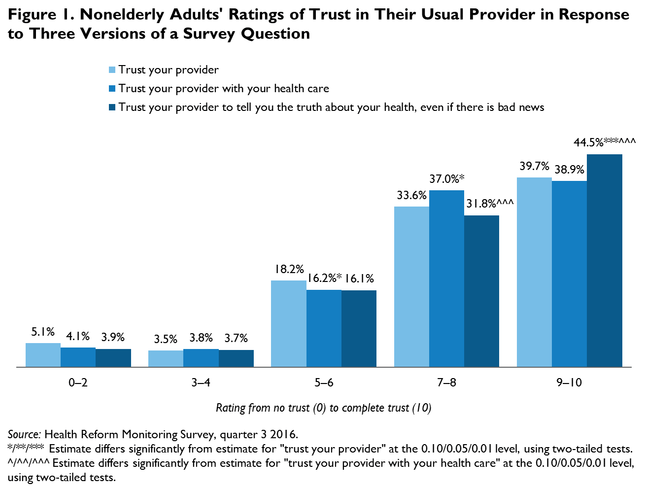 This brief draws on data from the September 2016 Health Reform Monitoring Survey (HRMS),1 which asked respondents how much they trust their providers. All adults in the sample were randomly assigned to one of four groups; each group was asked a different version of a question about their trust in the doctor or other health care provider they see most often for their health care. The different versions were based on a supplemental question from the Consumer Assessment of Healthcare Providers and Systems (CAHPS),2 and assignment was randomized to test whether respondents’ ratings of trust in their provider differed significantly when they were asked to assess different concepts of trust. Here, we focus on three versions of the trust question.3 The groups were asked to rate on a scale of 0 to 10, where 0 indicated that they did not trust their provider at all and 10 indicated that they trusted their provider completely,