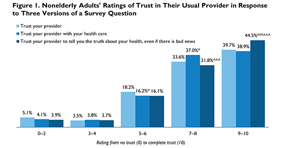 Trust in providers was high among nonelderly adults across all three versions of the trust question (figure 1). The median response category was a rating of 7–8 on the 0 to 10 scale. Approximately 40 percent of adults rated their trust in their usual provider a 9 or 10, and less than 20 percent gave ratings in the middle of the scale, at 5 or 6. Less than 10 percent of adults gave low ratings, from 0 to 4. Adults who gave trust ratings below the median category of 7–8 tended to be younger, nonwhite, and low-income, as shown in Bart and Long (2017b).