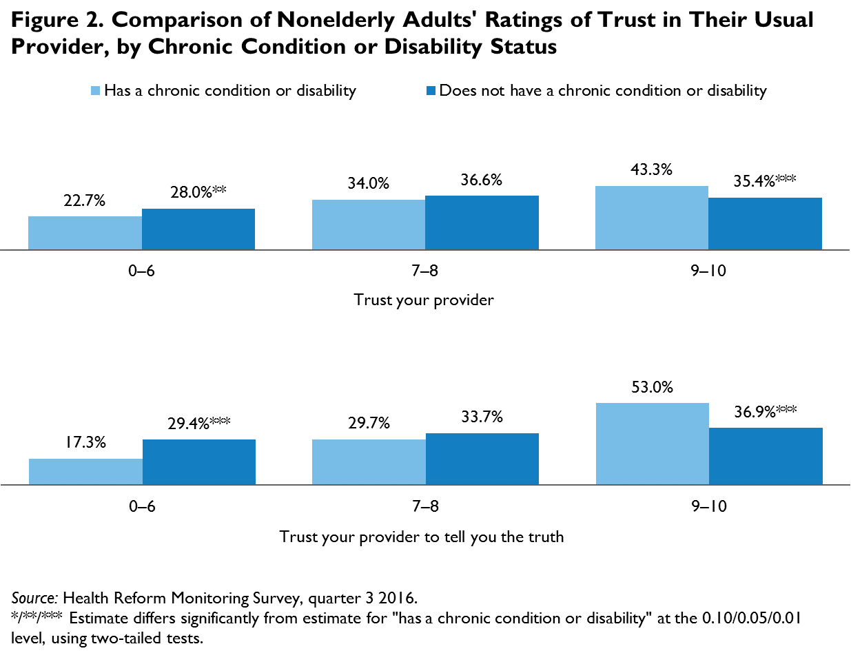 Adults with a chronic condition or disability differed significantly from those without in how they rated their trust in their provider and how they rated their trust in their provider to tell them the truth about their health, even if there was bad news. Adults with health problems were more likely than those without to rate their trust in their provider a 9 or 10 (43.3 percent versus 35.4 percent), and more likely to rate their trust in their provider to tell them the truth about their health a 9 or 10 (53.0 percent versus 36.9 percent; figure 2). Although we cannot determine the causes of these differences in trust, the higher trust ratings among adults with a chronic condition or disability may reflect more frequent interactions with providers and, specifically, more frequent contact that included bad news.