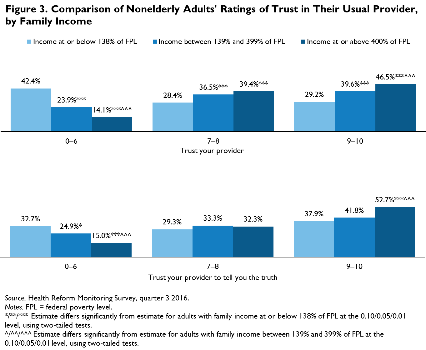 Ratings of trust in providers and trust in providers to tell the truth about patients’ health differed significantly across family income groups. Only about three in ten adults with incomes at or below 138 percent of the federal poverty level (FPL) rated their trust in their provider a 9 or 10, compared with 40 percent or more of higher-income adults (figure 3). Similarly, 37.9 percent of low-income adults and 41.8 percent of moderate-income adults rated their trust in their provider to tell them the truth about their health a 9 or 10, compared with over 50 percent of adults with high incomes.