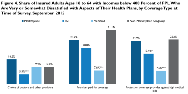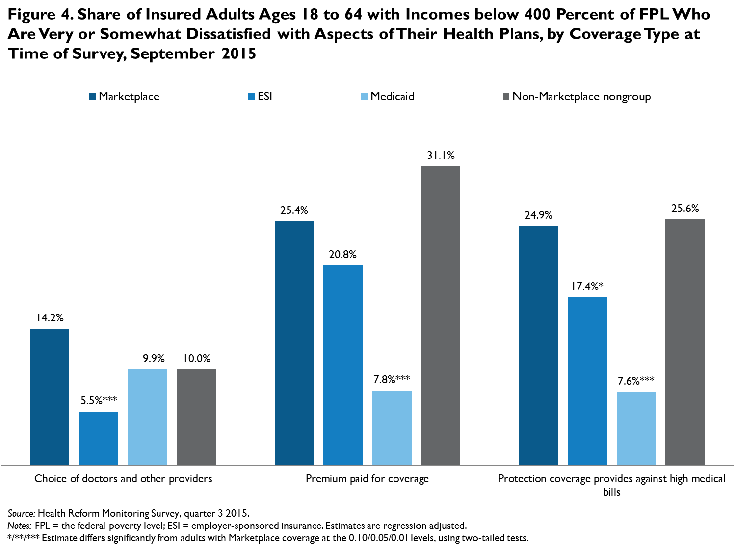 In figure 4, we see that low- and moderate-income Marketplace enrollees were more likely to be dissatisfied (14.2 percent dissatisfaction among enrollees) with their choice of doctors and other providers than adults with ESI (5.5 percent). Dissatisfaction with choice of providers among Marketplace enrollees was not statistically different from levels of dissatisfaction among those with Medicaid (9.9 percent) or non-Marketplace nongroup coverage (10.0 percent).