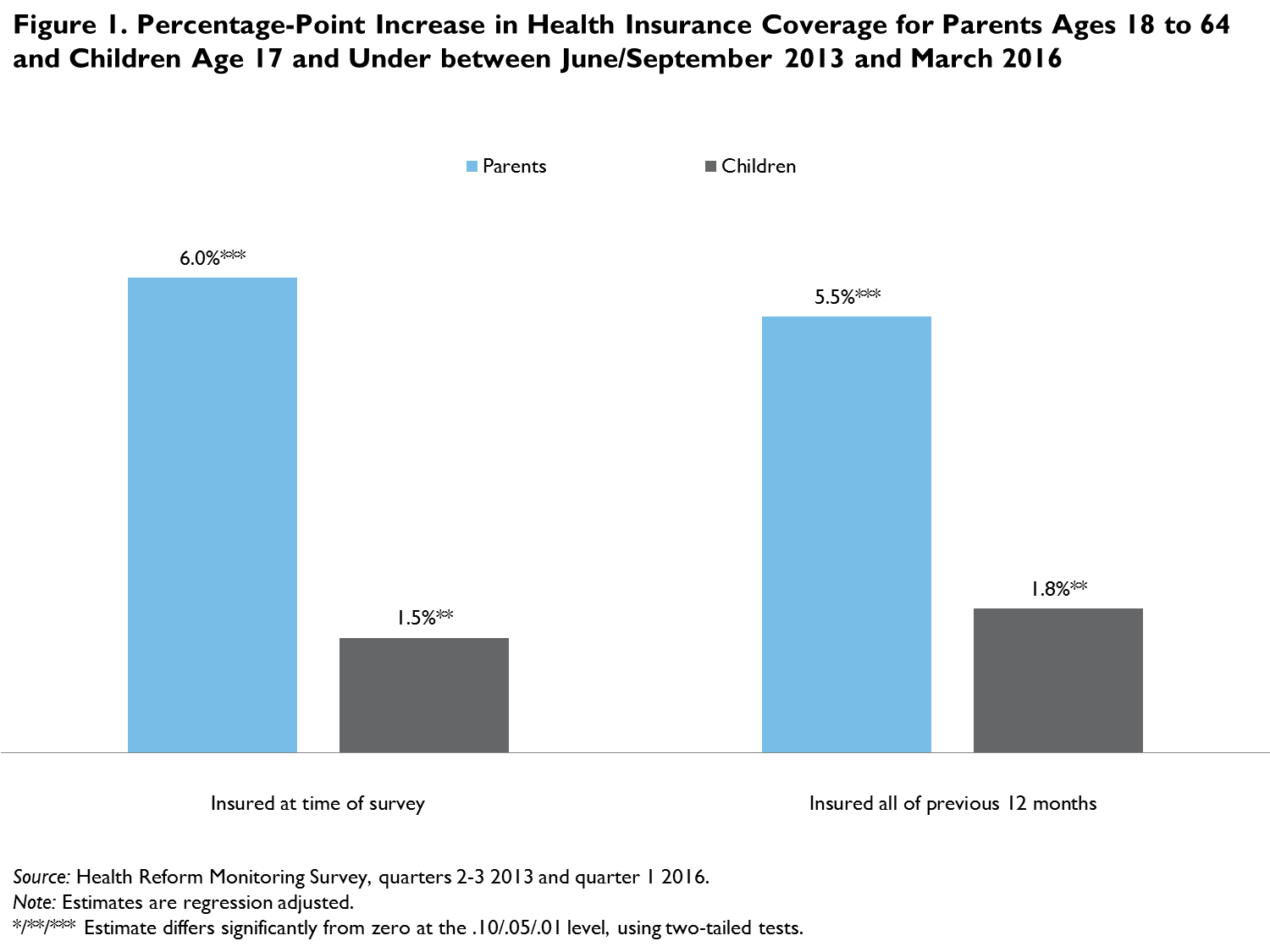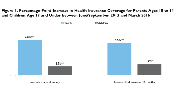 Between June/September 2013 and March 2016, parents and children experienced gains in coverage and were more likely to be insured for a full year.