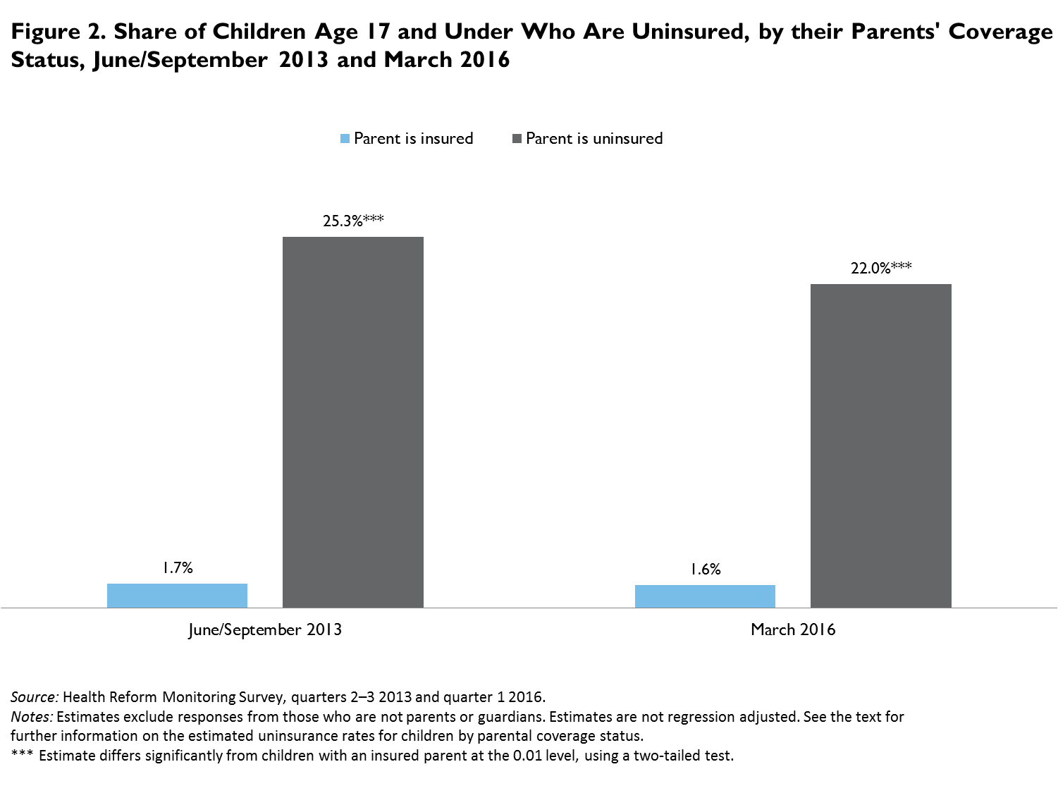 Although children were less likely to have an uninsured parent in March 2016 relative to June/September 2013, those with an uninsured parent remained much more likely to be uninsured compared to children with an insured parent (figure 2).11 In March 2016, we found a 22.0 percent uninsurance rate for children whose parents were uninsured compared with a 1.6 percent uninsurance rate for children whose parents were insured.
