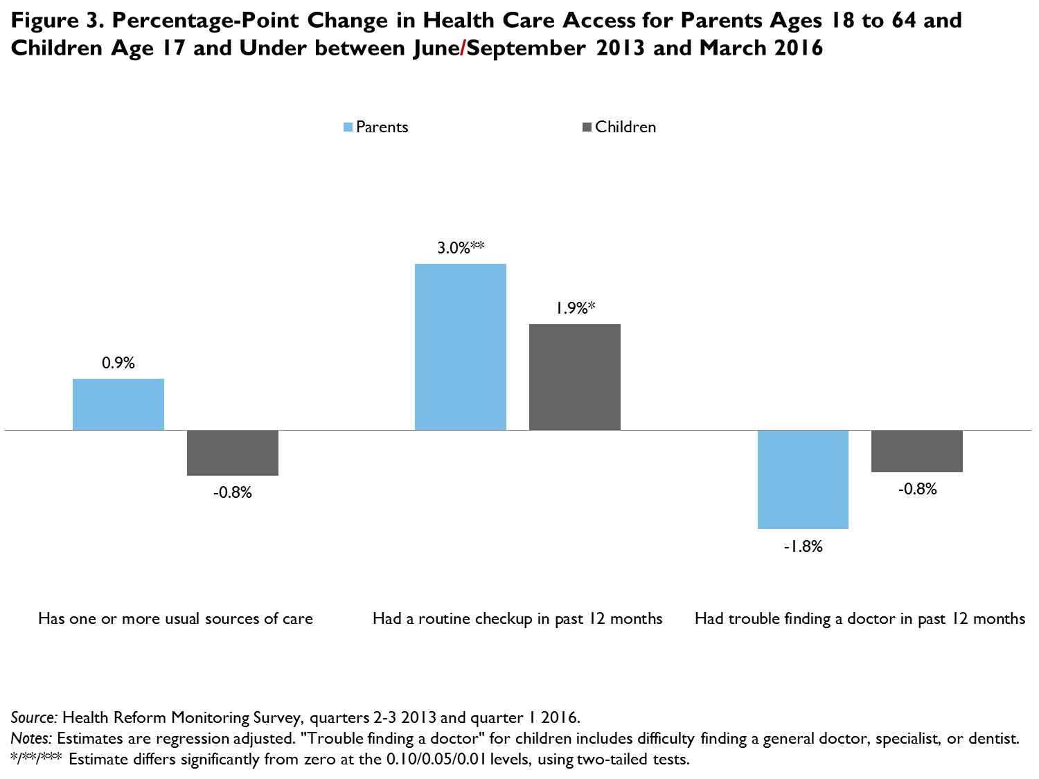The share of parents who have had a routine checkup in the past 12 months increased 3.0 percentage points (95% CI [0.6, 5.4]) between June/September 2013 and March 2016, and the share of children who have had a routine checkup in the past 12 months increased 1.9 percentage points, though the latter estimate is only significant at the 0.10 level (figure 3). For both groups, there was no statistically significant change in the percentage that had a usual source of care or in the percentage that has had trouble finding a doctor, though more access problems were reported for parents than for children. As of March 2016, more than 9 in 10 children and nearly three-quarters of parents reported a usual source of care, and about one in 5 parents (19.2 percent) and one in 10 children (9.6 percent) had difficulty finding a doctor in the previous year (appendix table 1).