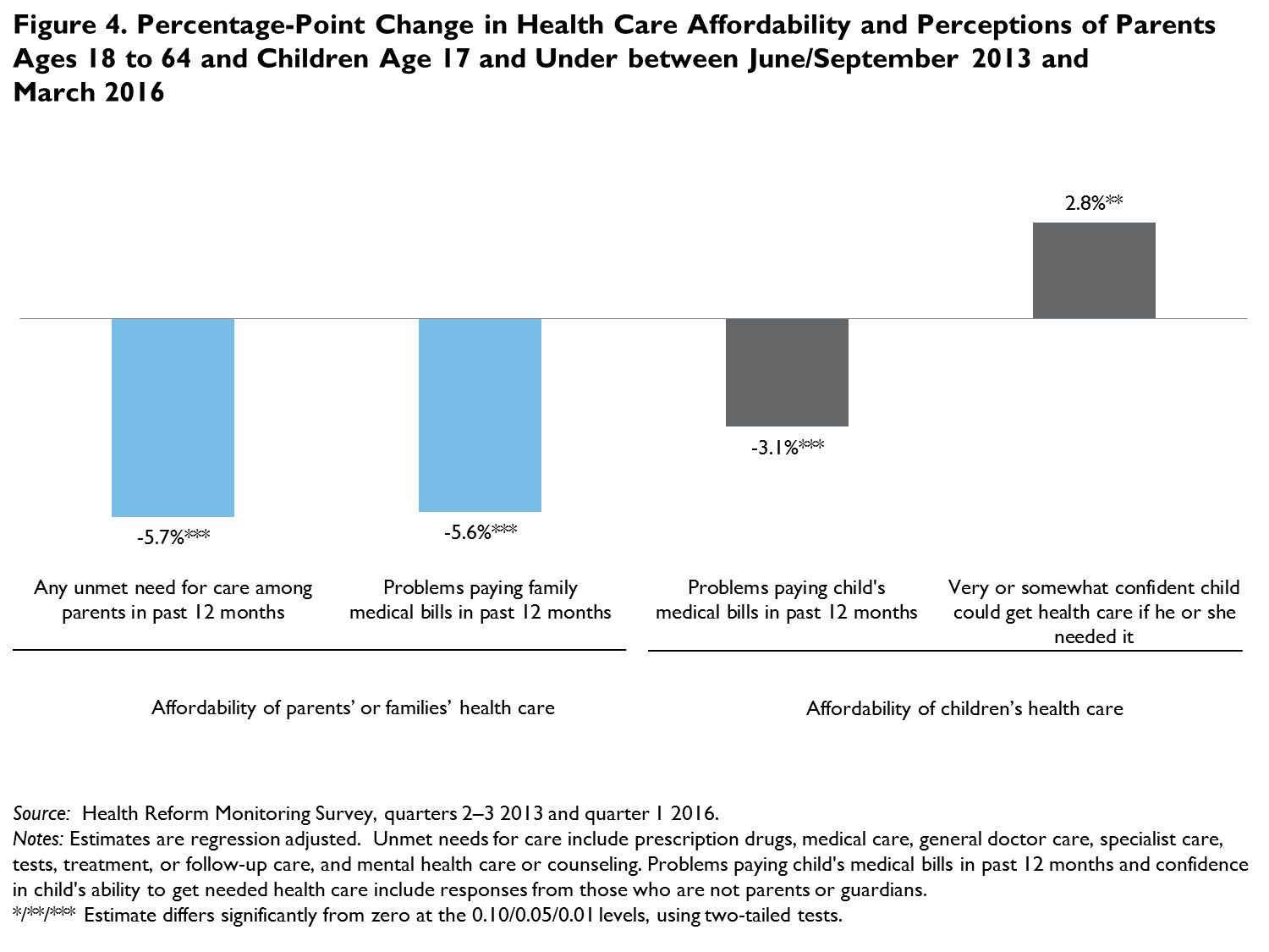 There were gains in reported health care affordability as reflected in several indicators. The share of parents who had an unmet need for care because of affordability reasons in the past 12 months fell 5.7 percentage points (95% CI [4.0, 7.4]) between June/September 2013 and March 2016 (figure 4).12 There was a 5.6 percentage-point decline (95% CI [3.0, 8.1]) in the share of parents reporting problems paying family medical bills and a 3.1 percentage-point decline (95% CI [1.1, 5.1]) in the share of adults reporting problems paying a child’s medical bills. Respondents were also 2.8 percentage points (95% CI [0.5, 5.0]) more likely to say they were confident that their child could get health care if he or she needed it. However, many parents, particularly those who are uninsured (data not shown), still struggled to afford health care, with 25.0 percent reporting an unmet need for care and 21.1 percent reporting problems paying family medical bills in March 2016 (appendix table 1).