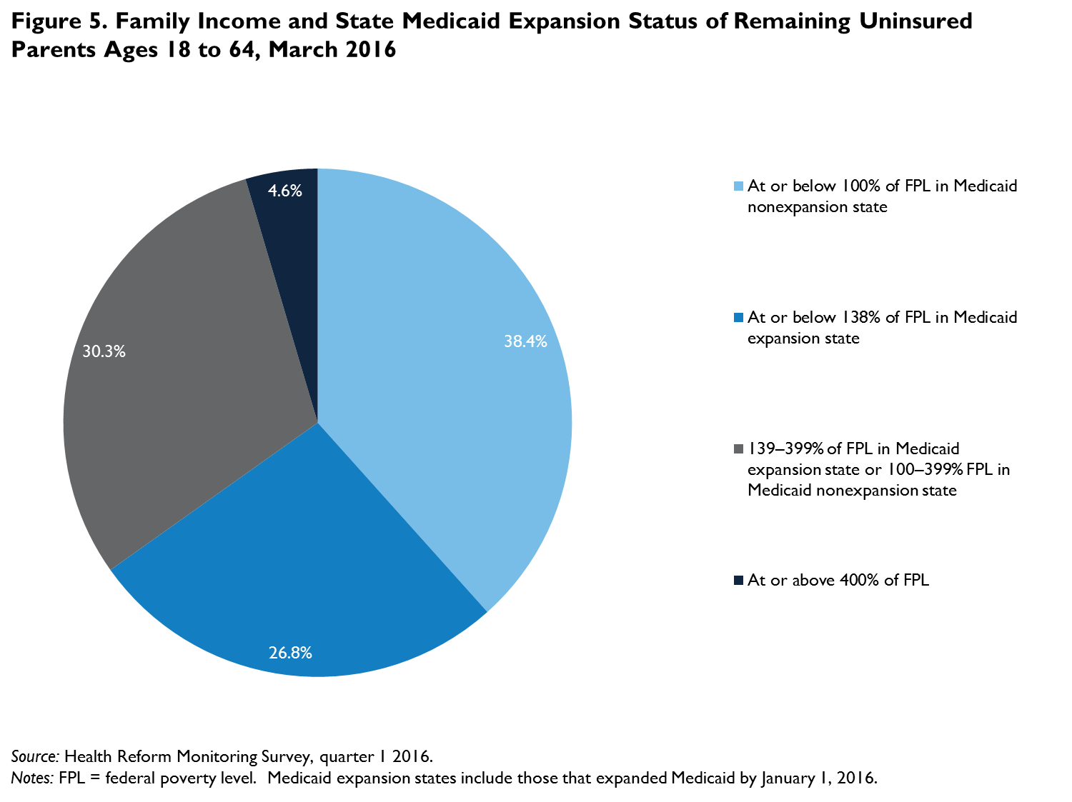 Nearly two in five (38.4 percent) parents who remained uninsured in March 2016 had incomes below 100 percent of FPL and lived in a state that had not expanded Medicaid as of January 2016 (figure 5). Many of these parents fall into a coverage gap because their incomes are too low to qualify for Marketplace premium subsidies but too high to qualify for Medicaid (Blumberg et al. 2016). In the states that did not expand Medicaid by January 2016, the median income eligibility threshold for parents is only 42 percent of FPL (Kaiser Commission on Medicaid and the Uninsured 2016).