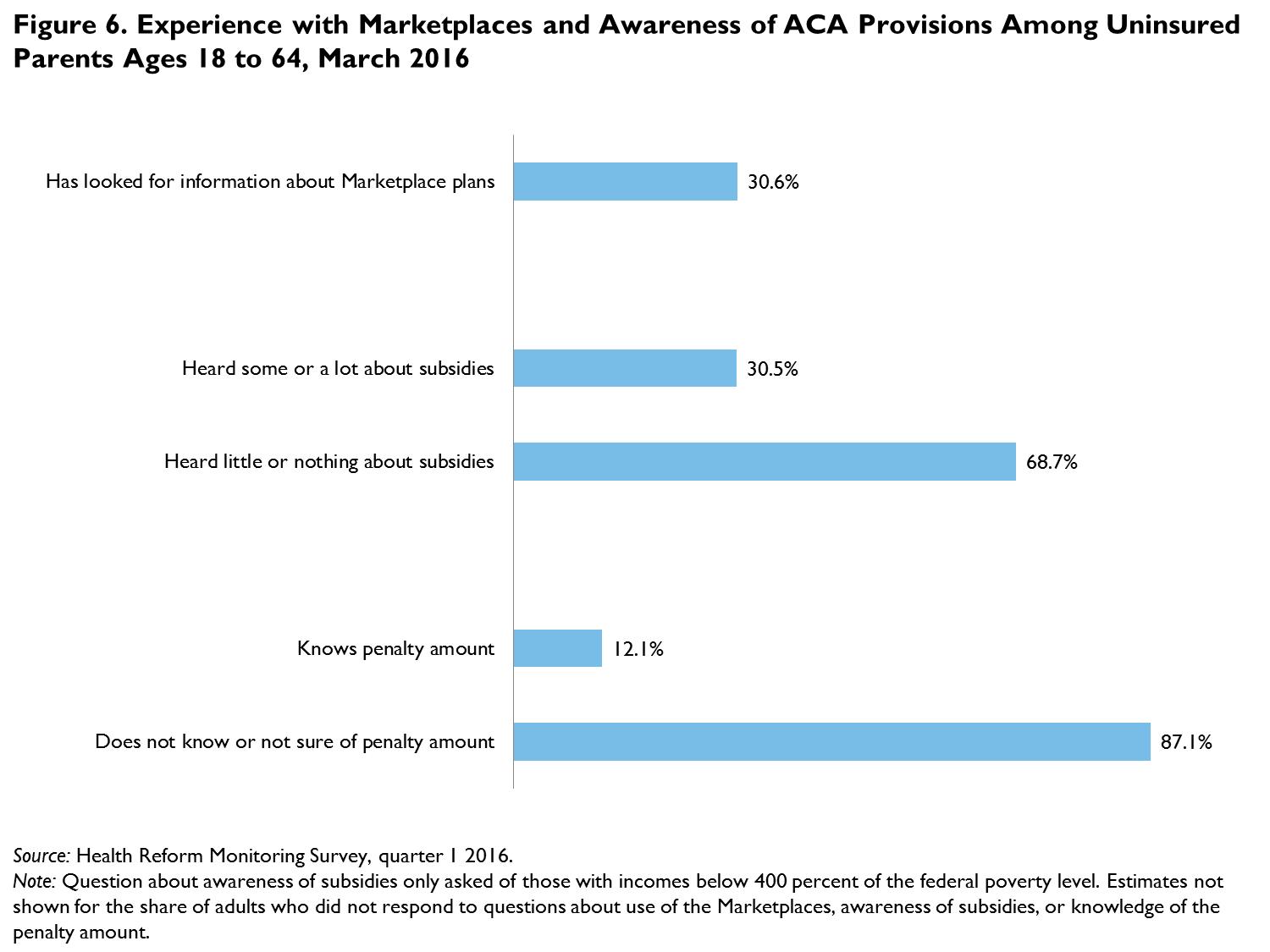 We conclude by examining whether the remaining uninsured parents have looked for information about health plans available through the Marketplace, how much those with incomes below 400 percent of FPL have heard about Marketplace premium subsidies, and whether uninsured parents know the correct amount of the tax penalty for not having coverage in 2016.9