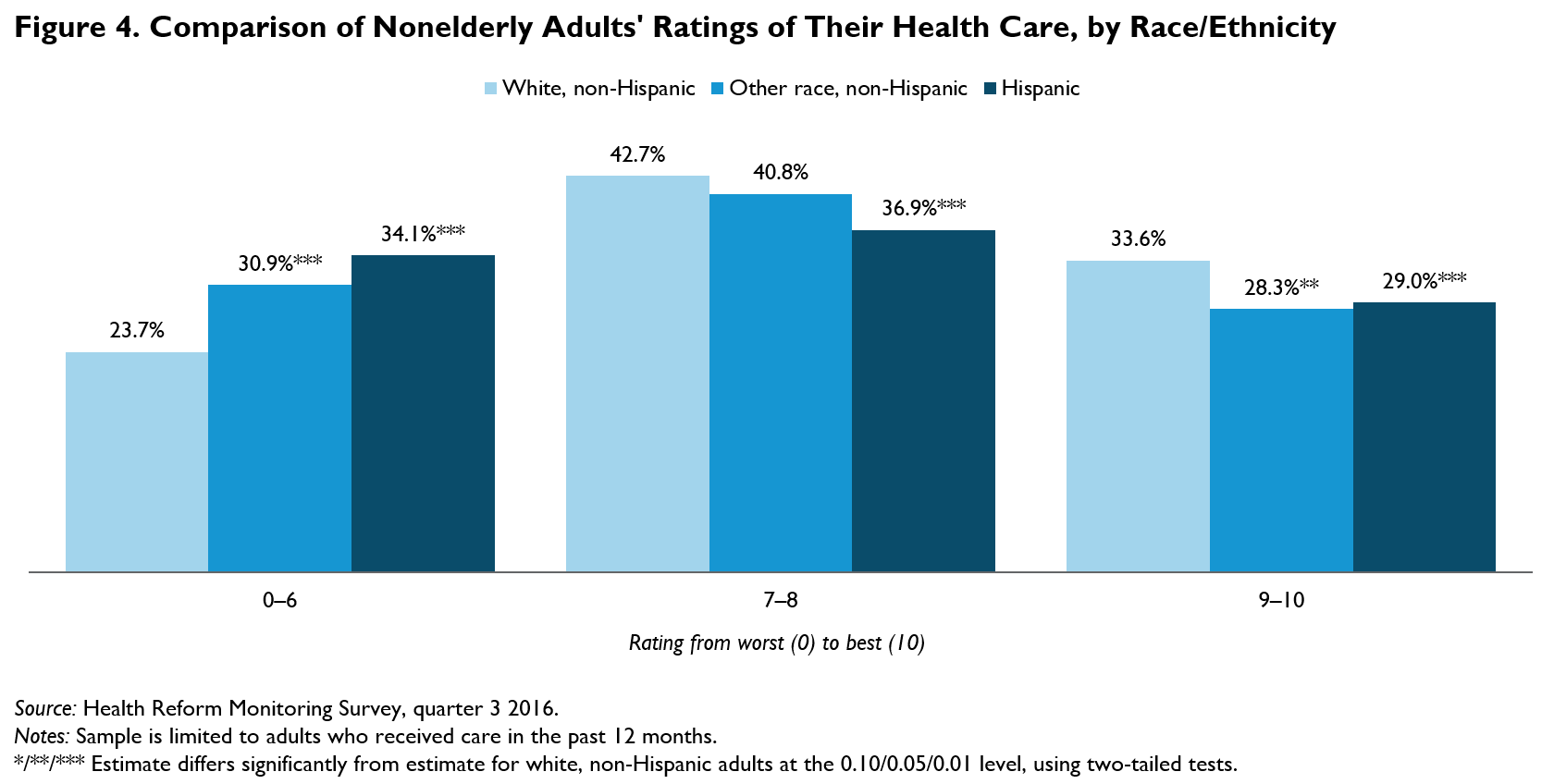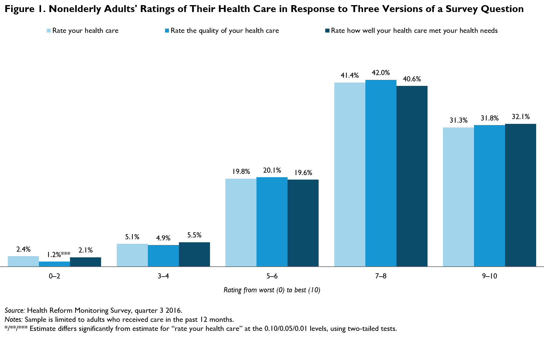 This brief draws on data from the September 2016 Health Reform Monitoring Survey (HRMS).2 All adults in the sample were randomly assigned to one of three groups, and each group was asked a different version of a question about the health care they had received over the past 12 months. The three versions were variations on a question from CAHPS,3 and assignment was randomized to test whether respondents’ health care ratings differed significantly with respect to different concepts of health care value. The groups were asked to rate on a scale of 0 to 10, where 0 represented the worst care possible and 10 represented the best care possible,