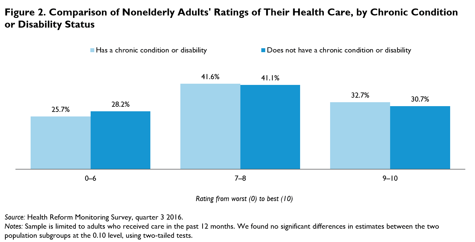 Nonelderly adults tended to rate their health care favorably no matter what version of the question they received (figure 1). Across all three versions of the health care question, the median response category was a rating of 7–8 on the 0 to 10 scale, with more than 30 percent of respondents rating their health care a 9 or 10. Another 20 percent of respondents gave ratings in the middle of the scale, at 5 or 6. Relatively few adults (less than 10 percent) gave ratings from 0 to 4. Adults who gave ratings below the median category of 7–8 tended to be younger, Hispanic or nonwhite, and lower-income, as shown in Bart and Long (2017).