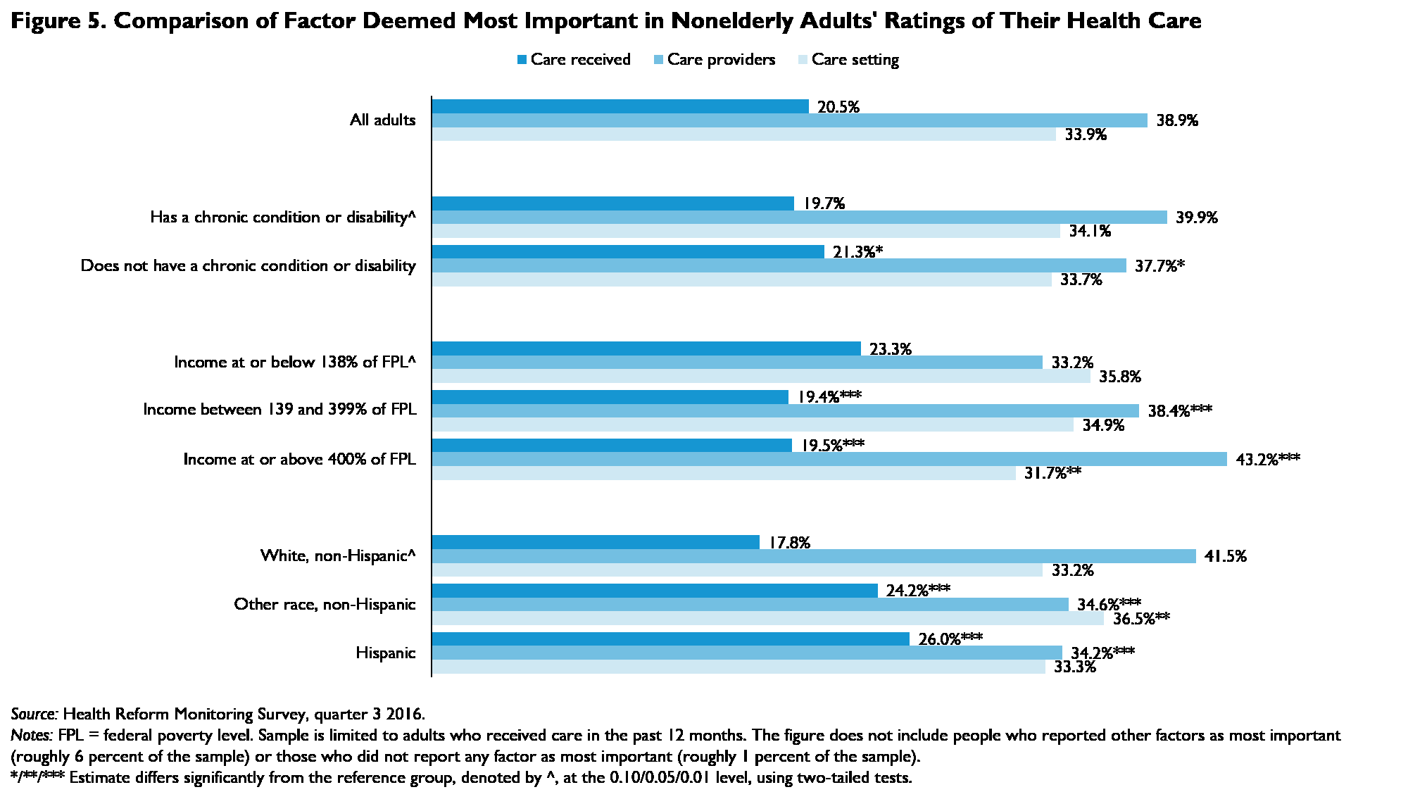 Care providers were most often reported as the most important factor in the health care rating; 38.9 percent of adults considered this most important, compared with 33.9 percent who considered care setting most important (figure 5). Only about one in five adults said the care they received was the most important factor in rating their health care.5