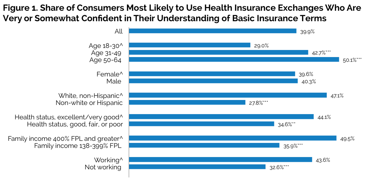 Among the groups targeted by the Marketplaces, basic health insurance terms are poorly understood. Only 39.9 percent feel very or somewhat confident that they understand all the insurance terms the survey asked them about (table 1). Only 43.8 percent say they feel confident that they understand all five terms related to costs (premiums, co-payments, etc.) and 50.0 percent say they understand all four terms related to access to care and benefits (provider network, covered services, etc.). Almost two-thirds (60.1 percent) of those most likely to use the Marketplaces to purchase coverage say they are not too confident or not at all confident in their understanding of at least one concept related to health insurance.