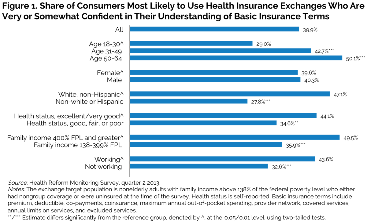 Almost two out of three adults specifically targeted for enrollment in the new health insurance Marketplaces (60.1 percent) report gaps in their understanding of basic insurance concepts, including co-payments, premiums, deductibles, coinsurance, and provider networks. And these estimates likely overstate consumers' actual understanding for two reasons. First, according to a recent study (Loewenstein et al. 2013), consumers understand less than they think they do. Second, the HRMS probably underrepresents low- and moderate-income adults with low literacy levels.