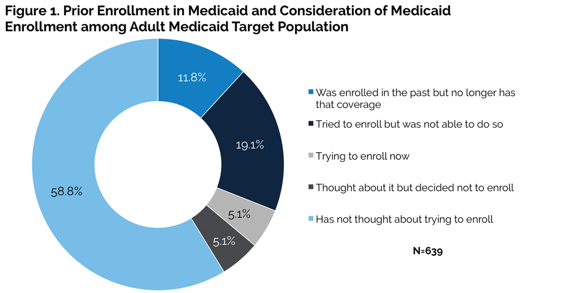 Just over one in ten low-income, uninsured adults targeted by Medicaid under the ACA report actual Medicaid enrollment in the past, and just over one-third have had prior Medicaid enrollment or application experience or are currently trying to enroll in Medicaid (figure 1). The roughly one-third (36.1 percent) of the adult Medicaid target population with prior or current experience trying to enroll in Medicaid encompasses three subgroups: those enrolled in the past who no longer have coverage (11.8 percent), those who tried to enroll but were not successful (19.1 percent), and those who are currently trying to enroll (5.1 percent). Most of the rest (58.8 percent of the total) said they had not thought about enrolling. Only 5.1 percent had thought about it but decided not to enroll.
