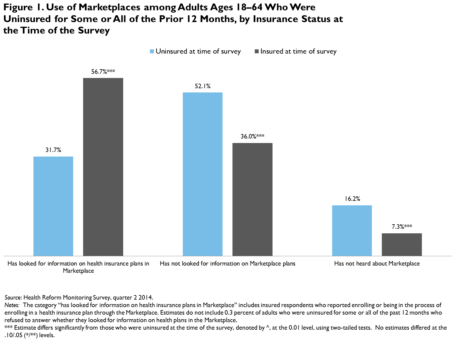 Even among adults who had been uninsured for some or all of the previous 12 months—a group with strong incentives to understand and act on the ACA’s coverage expansion provisions—only about 40 percent had looked for coverage through the Marketplaces as of June 2014. The remainder had either not heard about the Marketplaces, had decided not to seek information, or had simply let the opportunity pass. Compared with adults who were still uninsured at the time of the survey, previously uninsured adults who had gained coverage as of June 2014 were more likely to have sought information from the Marketplaces, even though the coverage they gained may not have been from a Marketplace qualified health plan.