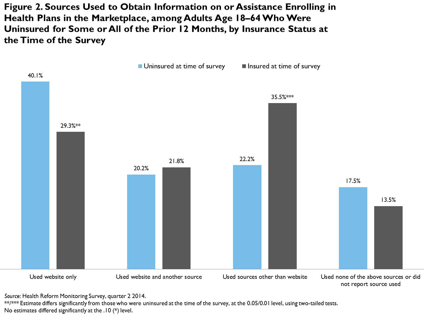 A growing body of evidence shows that the number of uninsured adults declined significantly since the Affordable Care Act’s (ACA’s) open enrollment period started in October 2013 (Long et al. 2014; Blumenthal and Collins 2014; Carman and Eibner 2014).1 This decline was achieved despite many widely publicized early problems with health insurance Marketplace websites. Although the vast majority of people turned to websites for information on the federal or state Marketplaces (Blavin et al. 2014a), many consumers used, and will likely continue to use, other sources for health insurance plan information (Blavin et al. 2014b). With the second open enrollment period on the horizon, new research is beginning to examine the paths people followed to (1) get information on Medicaid eligibility or Marketplace health plans and subsidies and (2) ultimately gain insurance coverage (PerryUndem 2014). These new findings provide guidance for refining outreach and education strategies.