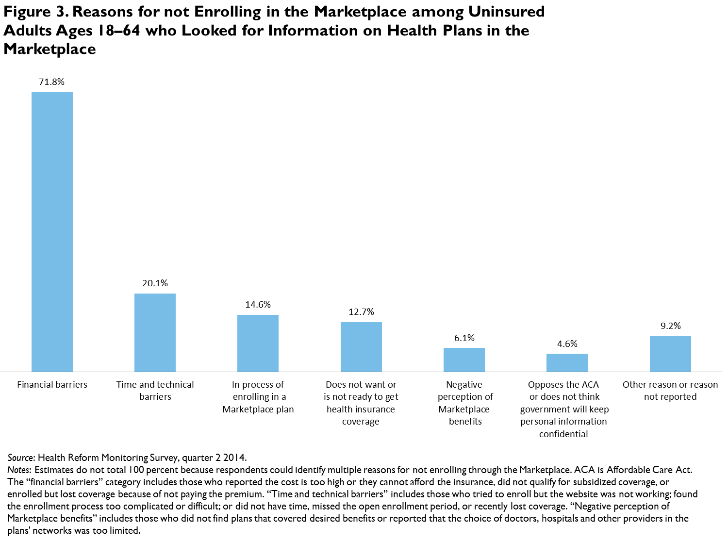 Even after looking for information, 71.8 percent of the adults who remained uninsured cited financial barriers as a reason for not signing up for coverage (figure 3). Other barriers to enrollment were cited much less frequently. Although the websites had well-documented problems, only 1 in 5 cited time and technical barriers as a reason for remaining uninsured. Some (14.6 percent) of the adults who remained uninsured as of June 2014 indicated that they had enrolled and their application was still being processed. Federal policymakers clearly recognize such processing delays as a real problem, because the Centers for Medicare and Medicaid Services has issued a letter to six states, including California, requiring them to come up with a plan to ease their Medicaid enrollment backlogs.2