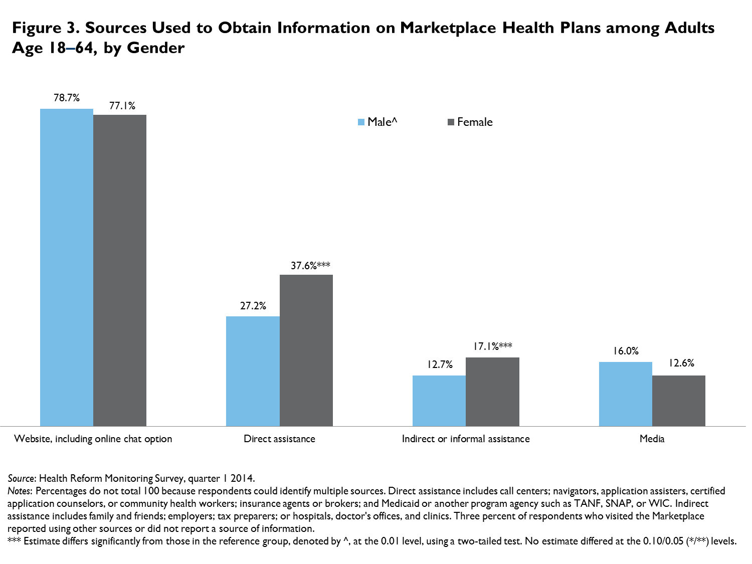 Men and women were about equally likely to obtain Marketplace information through a website, but women relied more heavily on direct assistance and indirect or informal assistance. Nearly 80 percent of men and women used a website to obtain information on Marketplace health plans (figure 3). There were also no significant differences in the share of men and women who used the media to obtain information. But women were more likely to use other types of assistance than men-37.6 percent of women used direct assistance compared with 27.2 percent of men, and 17.1 percent of women used indirect or informal assistance compared with 12.7 percent of men.