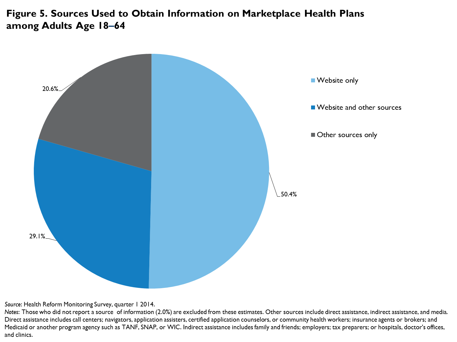 Despite the technical flaws with Healthcare.gov and state websites in the first three months of Marketplace open enrollment, the vast majority of adults who looked for information on health insurance plans in the Marketplaces used a website. But about half of adults used a source other than a website to obtain Marketplace health plan information. Among this half, roughly 60 percent used other sources in addition to a website and around 40 percent used nonwebsite sources only.