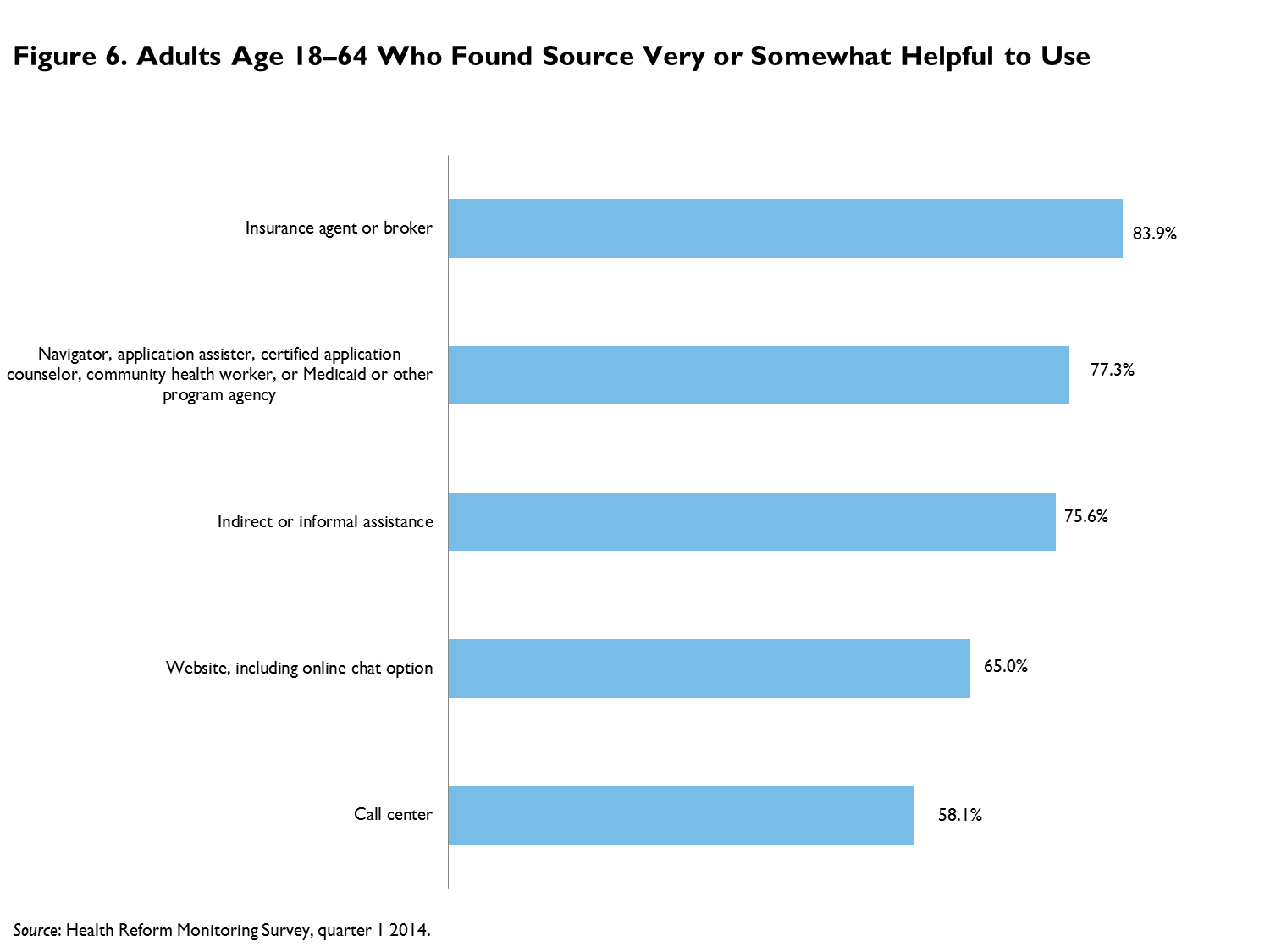 Most respondents found each source to be very or somewhat helpful in obtaining information on Marketplace plans (figure 6). Insurance agents and brokers had the highest rating; over 80 percent of adults who used them found them very or somewhat helpful. About three-quarters of adults who used any form of assistance involving a person, other than the call centers, found them to be very or somewhat helpful. Websites and the call center had slightly lower ratings: nearly two-thirds (65.0 percent) of nonelderly adults who used a website and 58.1 percent of those who used a call center found these sources to be very or somewhat helpful. At least 60 percent of those who used a website, in all subgroups, found it to be very or somewhat helpful (data not shown).