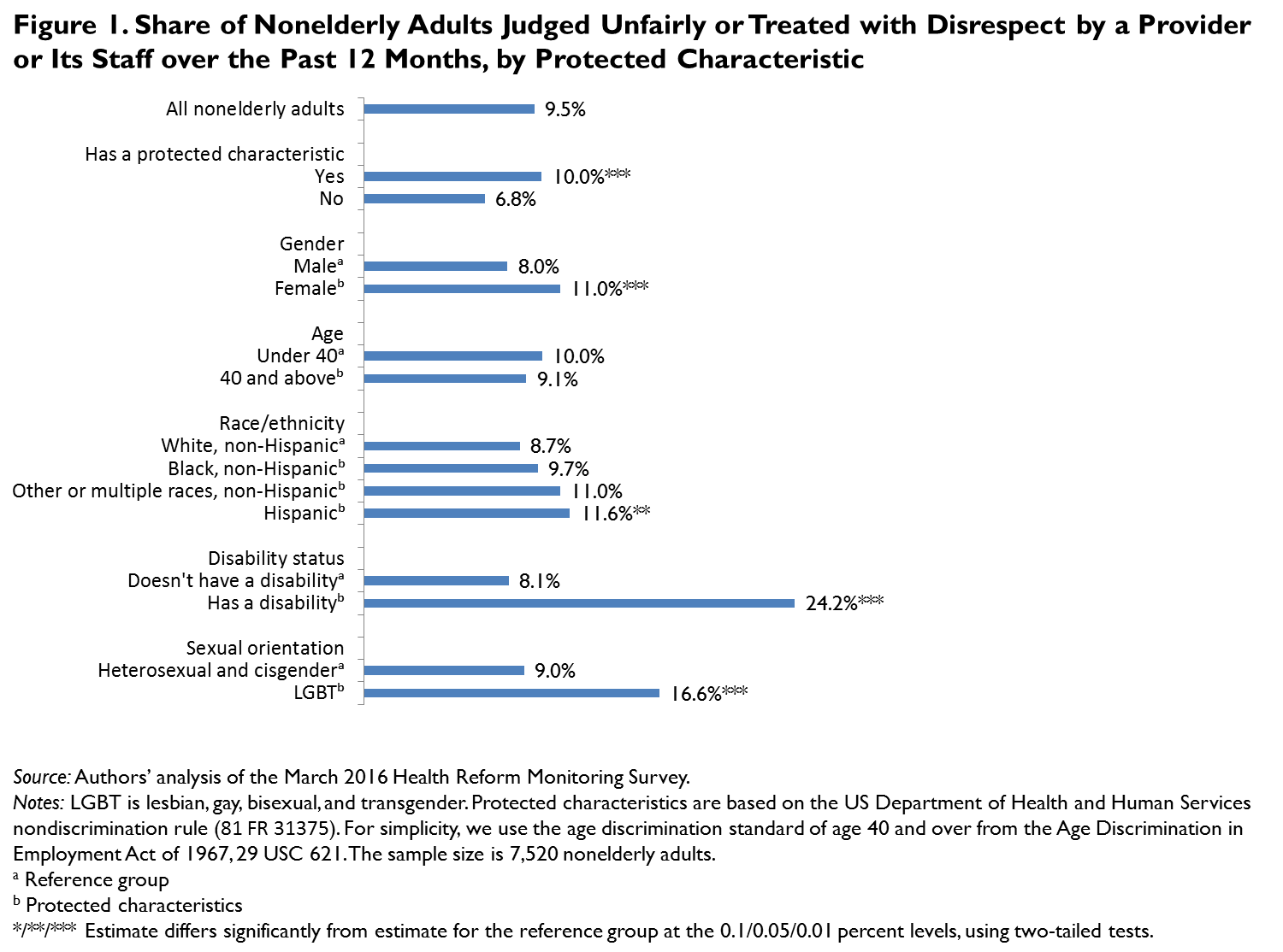 Results Overall, nearly 1 in 10 nonelderly adults (9.5 percent) reported being judged unfairly or treated with disrespect by a provider or its staff over the past 12 months in March 2016 (figure 1). Adults who had a protected characteristic were more likely to report such treatment than those who did not (10.0 percent versus 6.8 percent, respectively), and poor treatment was reported most frequently among adults with disabilities (24.2 percent), LGBT adults (16.6 percent), Hispanic adults (11.6 percent), and women (11.0 percent).