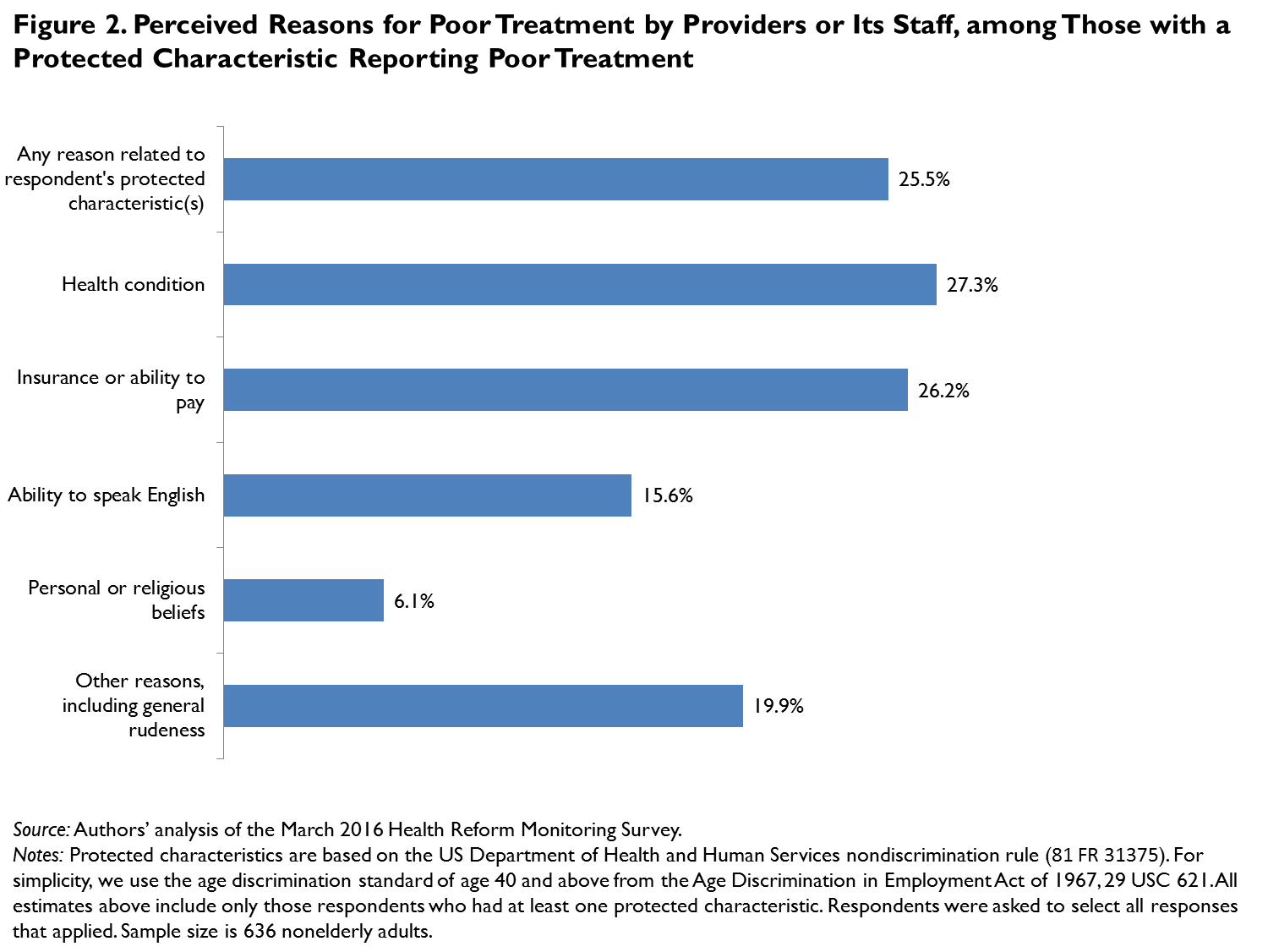 Several studies have shown that many vulnerable populations, including adults with disabilities, racial and ethnic minorities, sexual minorities, and low-income adults, report difficulties obtaining needed care (Agency for Health Care Research and Quality 2016; Centers for Disease Control and Prevention 2013; Iezzoni, Frakt, and Pizer 2011; Karpman and Long 2015; Shartzer, Long, and Anderson 2015; Skopec and Long 2015), and that certain populations may face discrimination in the provision of health care services (Institute of Medicine 2002; Lambda Legal 2010). The US Department of Health and Human Services recently published final regulations implementing section 1557 of the Affordable Care Act; those regulations protect certain vulnerable groups against discrimination in health care activities and programs established or funded by the federal government,1 in part to promote equity in the health care system.2 This paper reports on poor treatment by health care providers and staff among adults who would be protected under the new rule3 and the effects of that treatment on their access to care.