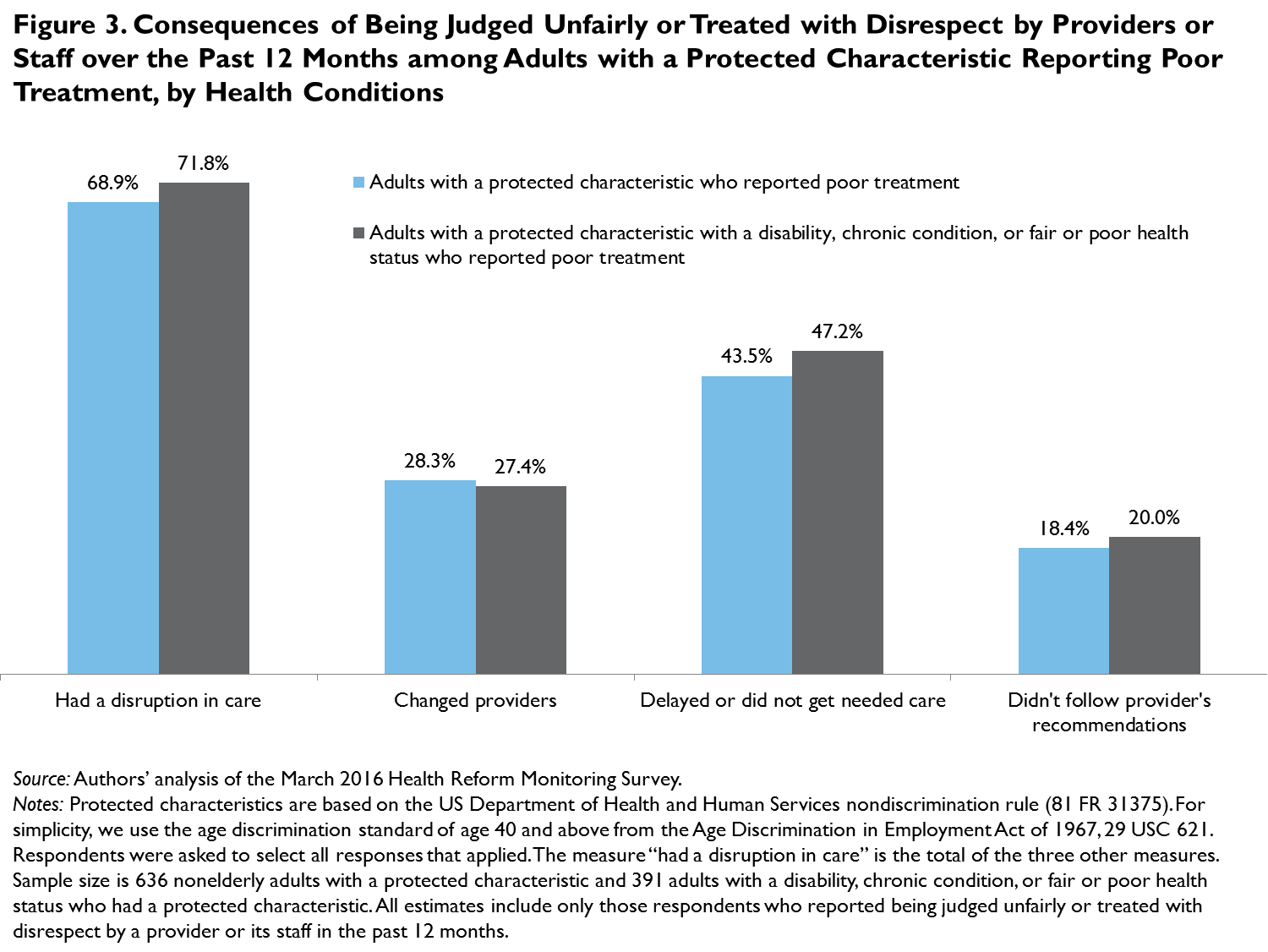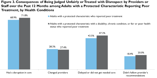 Among those reporting poor treatment who had a disability, chronic condition, or fair or poor health status, nearly three-quarters (71.8 percent) reported changing providers, ignoring provider recommendations, or delaying or forgoing needed care, raising concerns about continuity of care for these vulnerable adults (figure 3).